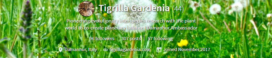 Tigrilla Gardenia is an inter-species researcher and a visionary, pioneering planetary balance by promoting the harmony between plants and animals. She had a kind of mixed bag career path, having dabbled in the corporate world with Microsoft and RealNetworks, moving on to circus work, having even done a stint with Cirque du Soleil. Now she's an inspirational speaker and Ambassador for Damanhur Spiritual EcoCommunity. She works to inspire urban biocentres co-created with plants and spends a great deal of time researching plant awareness and the human interaction with this. I came across Tigrilla Gardenia thanks to @practicalthought and I'm so glad he recommended her blog to me. Reading her work has been both educative and inspirational to say the least.