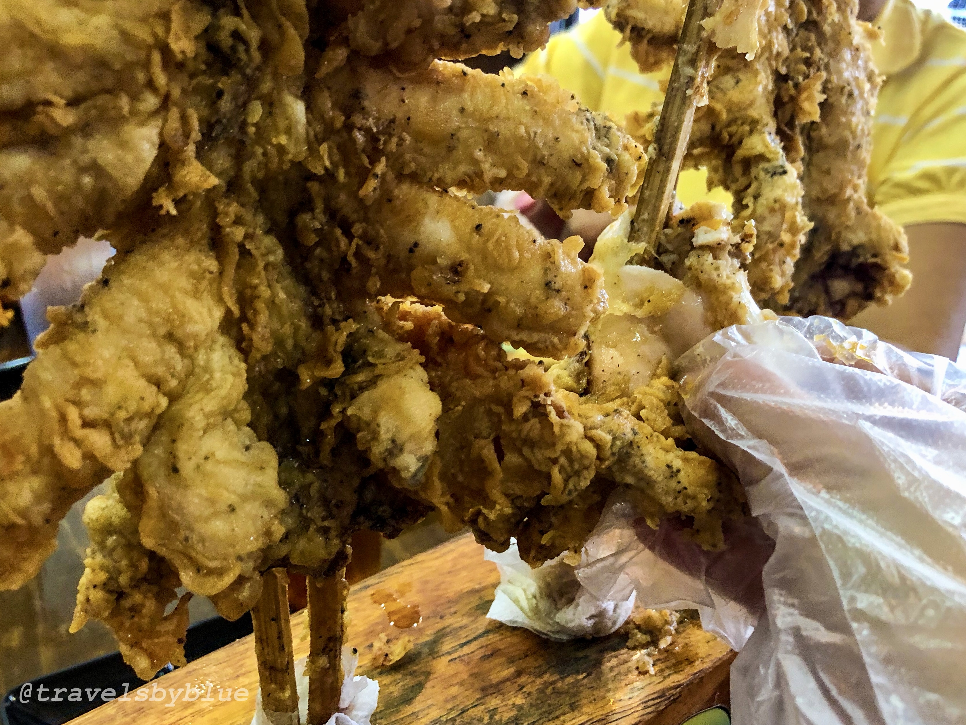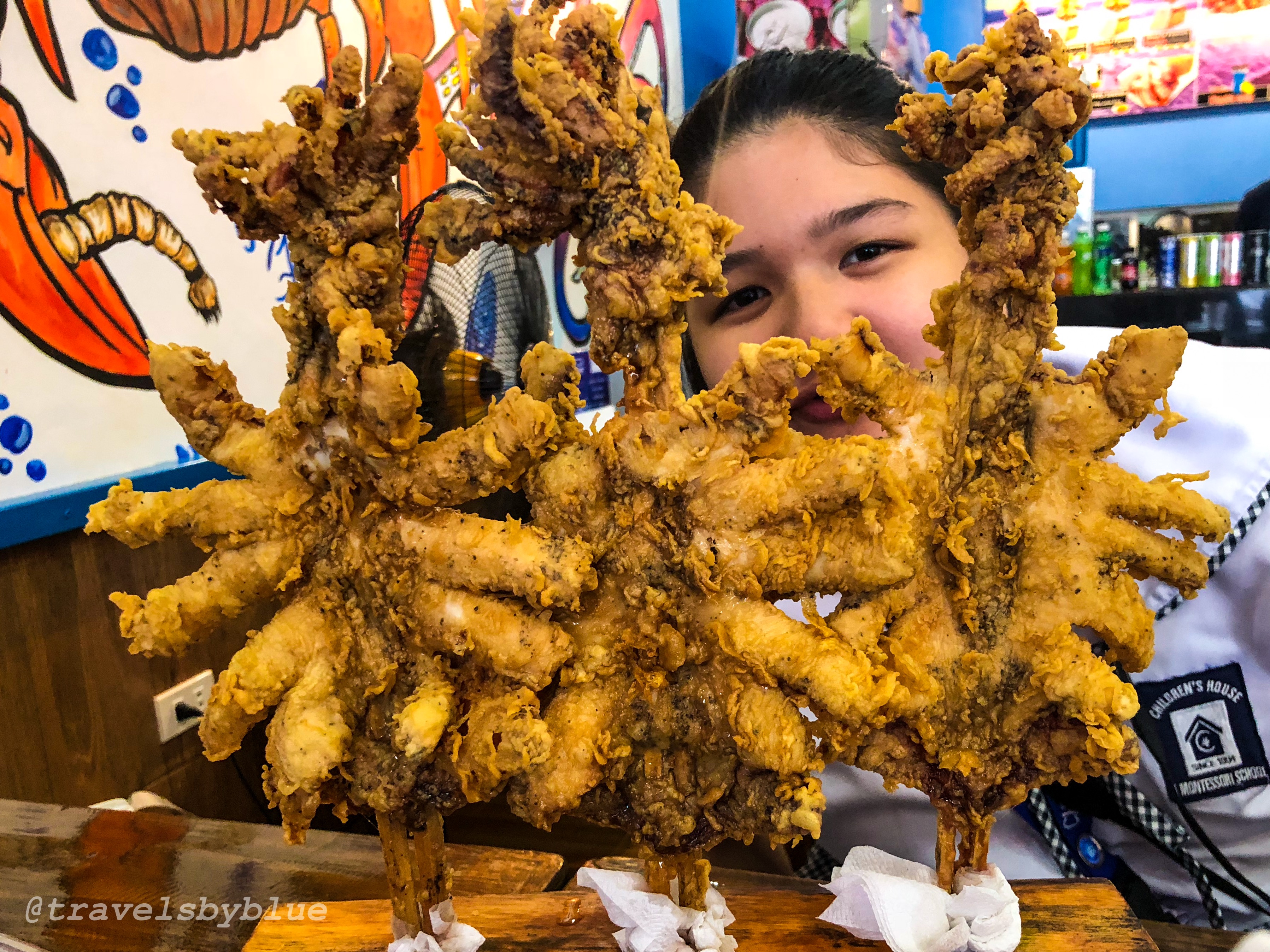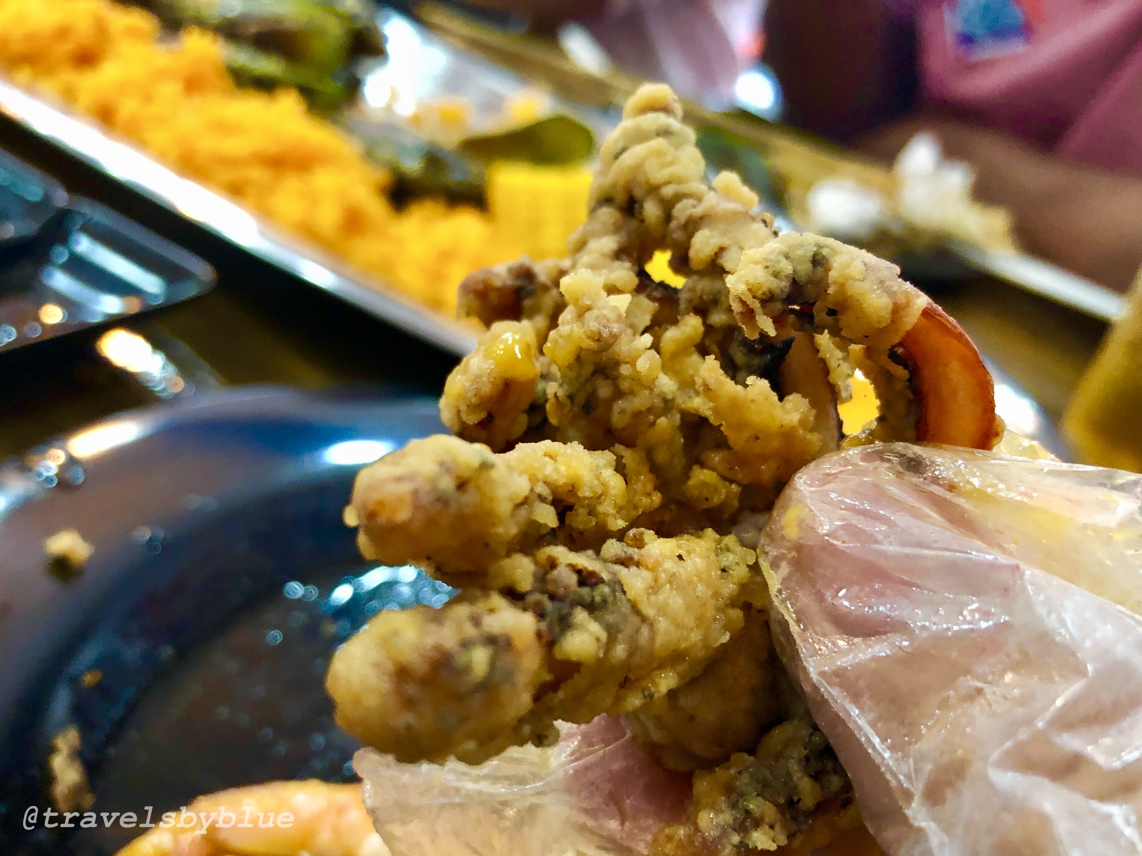 And I know, you already have the idea of how big it was. Yeah, about the size of our face or bigger? Haha! These giant squid are skewered upside down, fried with flavored breading, crispy on the outside and soft meat on the inside that you can actually tear off by your hand. Since, it is a seafood restaurant they don’t have spoon and fork, you will be eating using your hands with plastic disposable gloves.