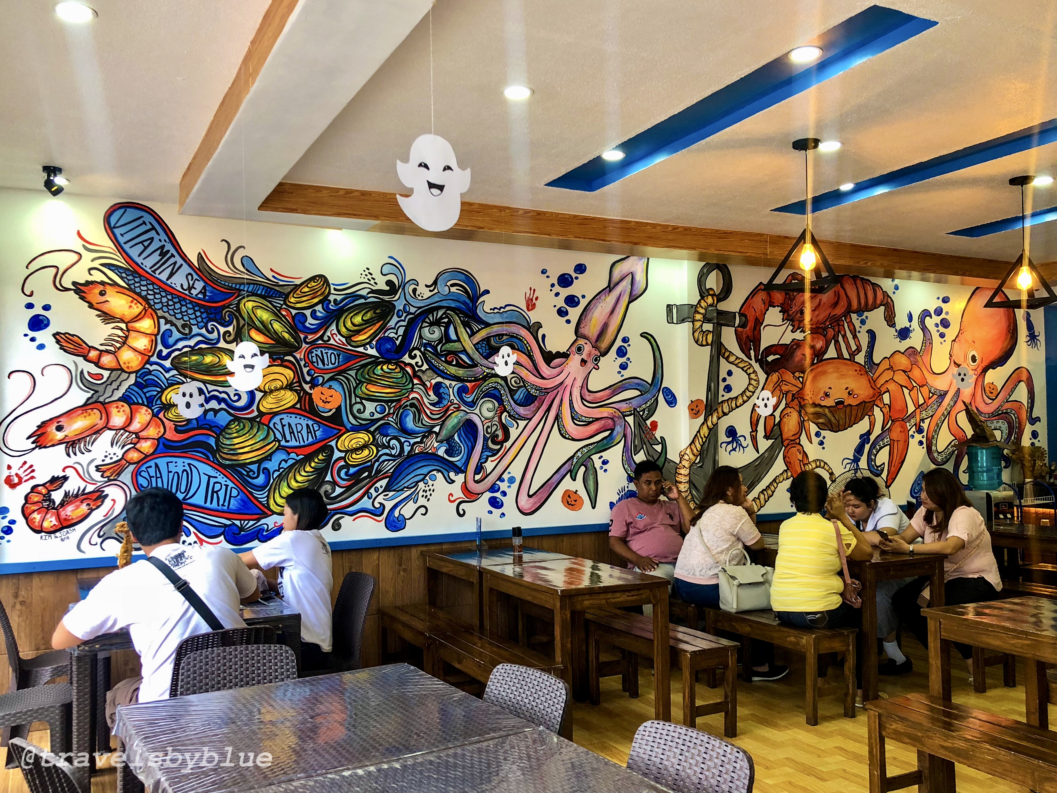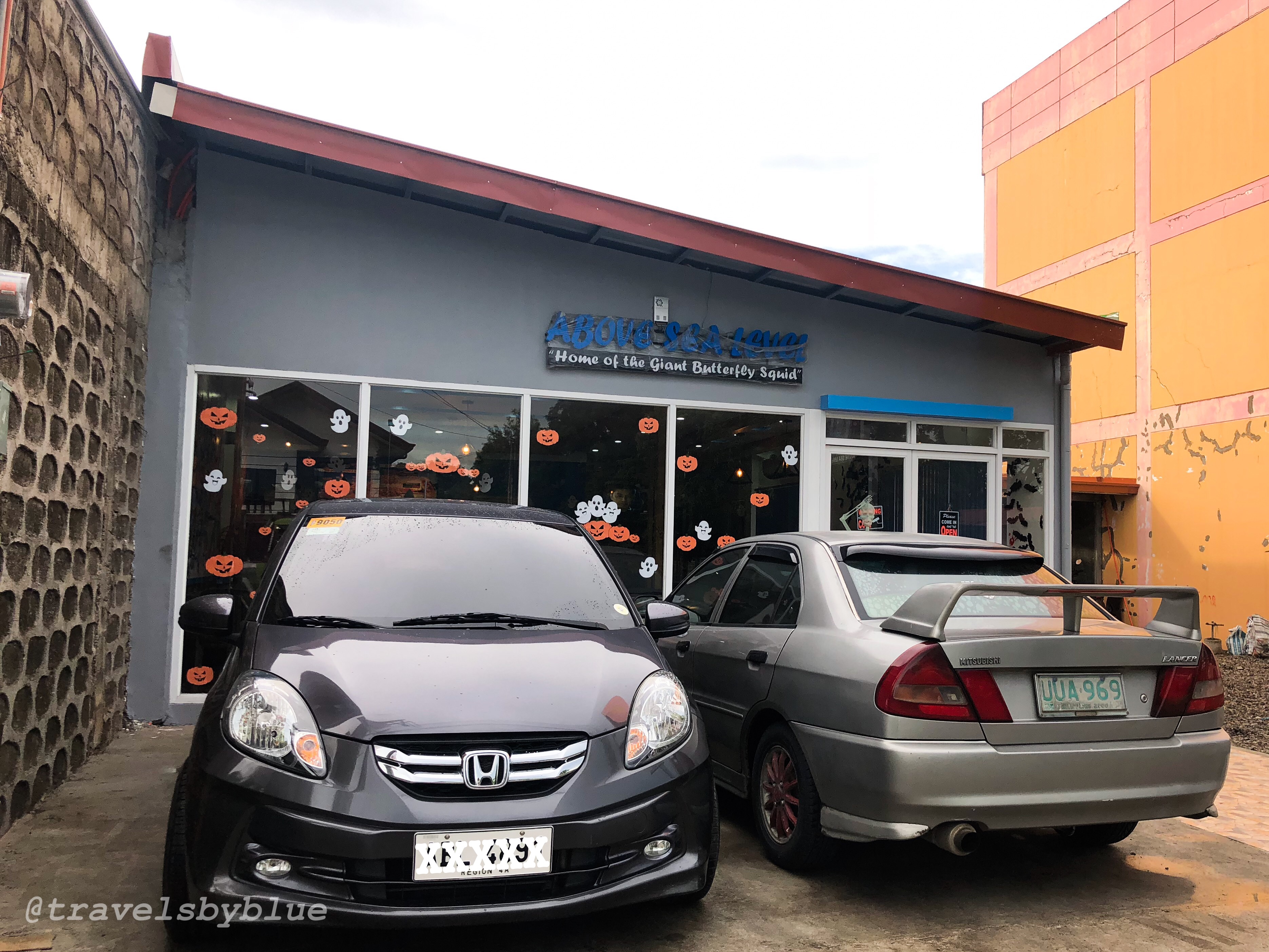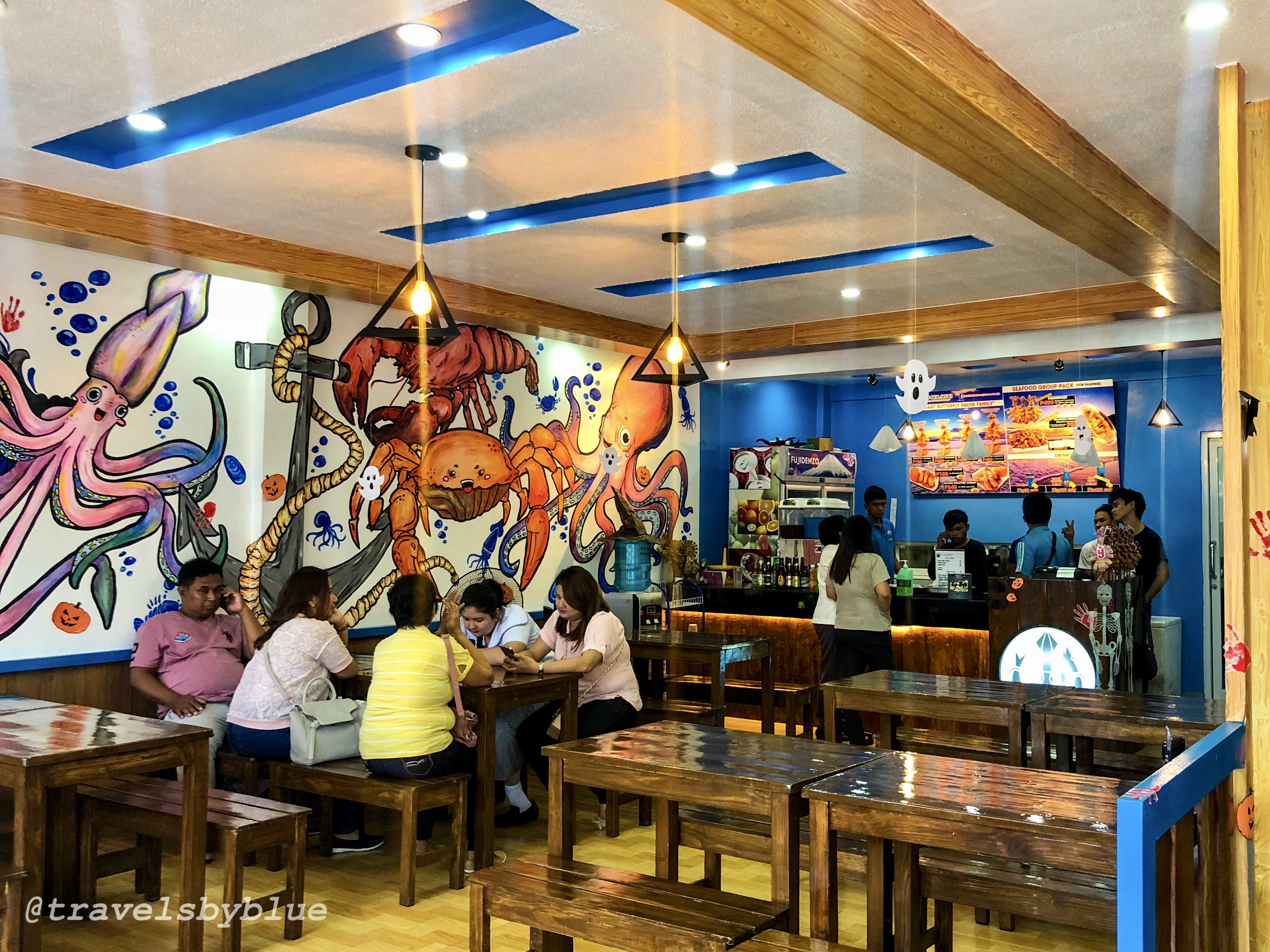 The place was not that big, perhaps it is about 100 square meters from the parking space that can occupied 3 cars (while others parked their car on the roadside, the parking is safe don’t worry 😂) and the dinning area inside is quite small too but spacious for few tables and chairs. Photos above are the actual perspective of the resto, the wall was painted by giant sea creatures and decorated by bats, smiling ghost, pumpkins and skeleton on the door for the forth coming Holloween.