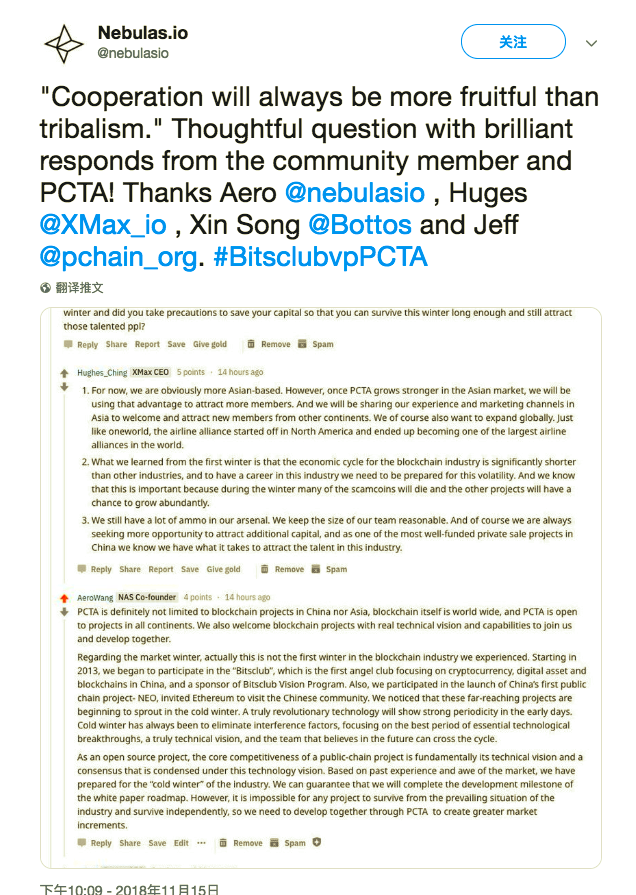 The Public Chain Technology Alliance held its launch on November 10th and hosted an online interactive session on the Reddit AMA on the evening of November 15. PCHAIN participated in the interaction with the NEBULA, PLATINUM, and XMAX, which attracted the attention of blockchain enthusiasts. The subsequent PCTA AMA will be hosted on cryptocurrency, which has 750,000 listeners.