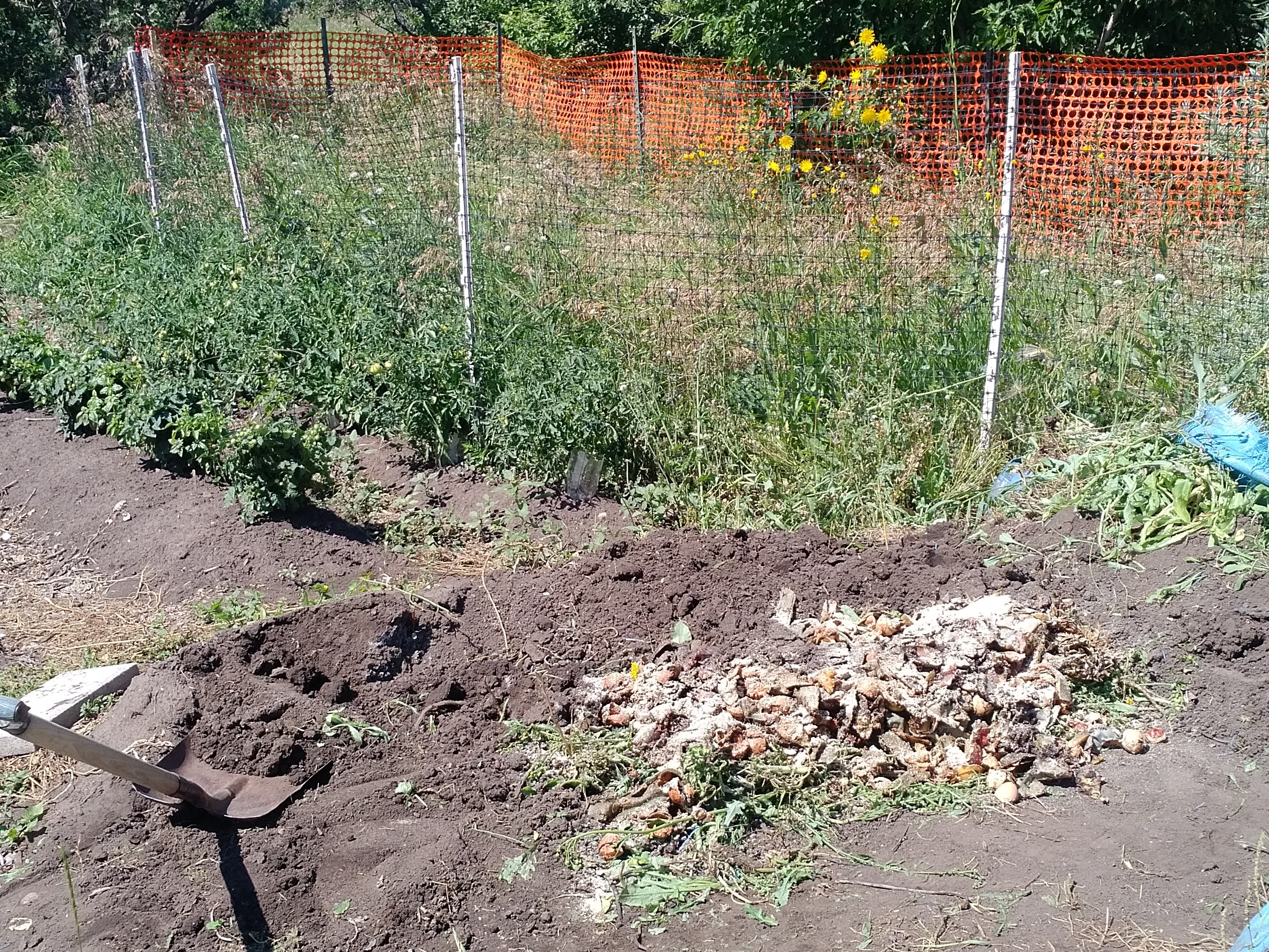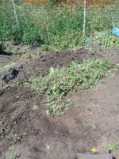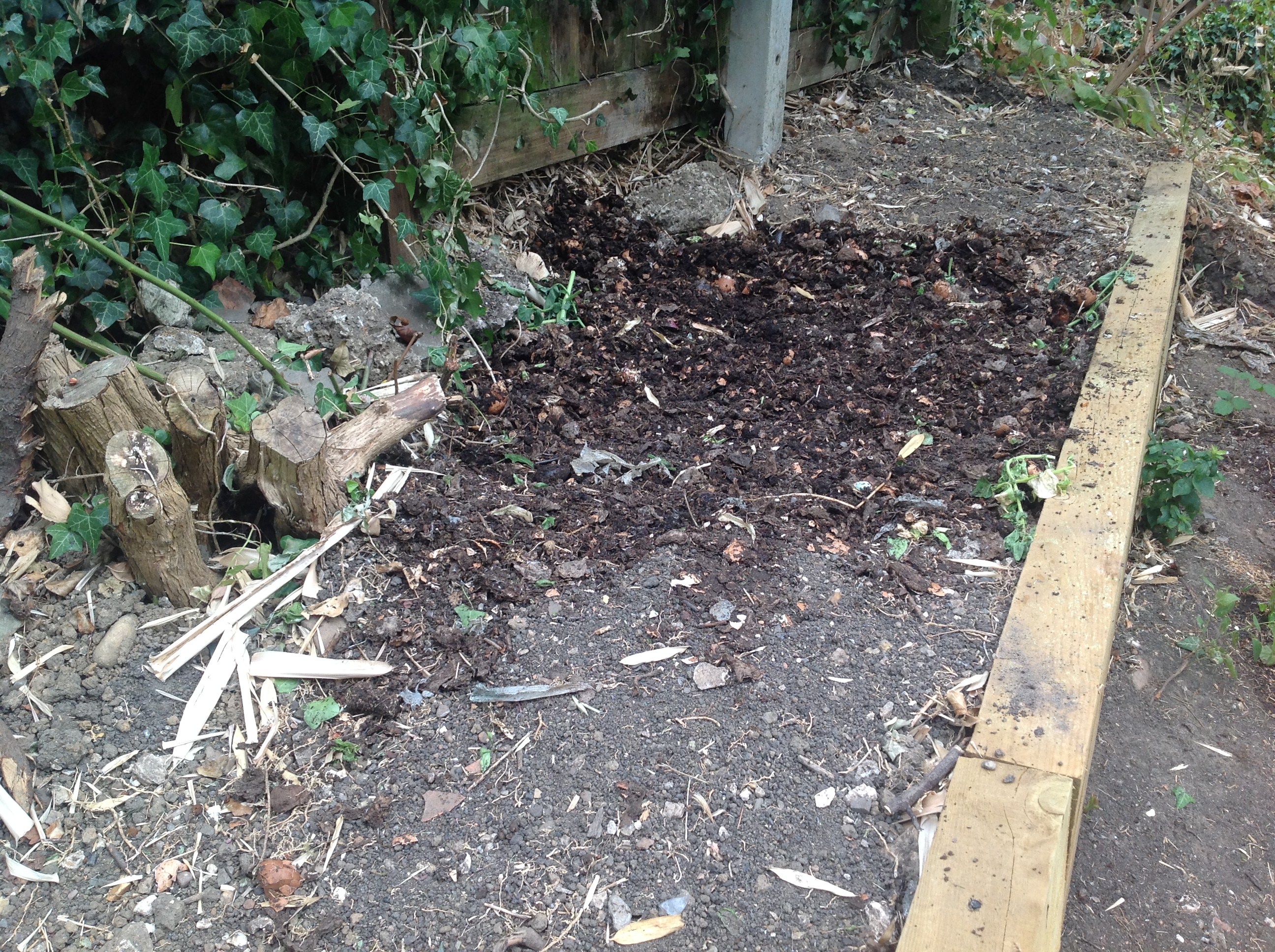 After all the roots had been axed out, there was a shallow depression which we filled with trimmings from the tomato plants and other vegetation, and then covered over with finest homemade compost:
