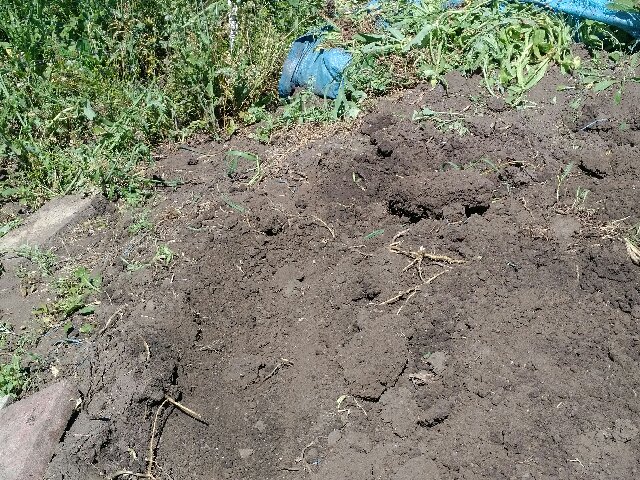 We had a pile of unused soil in the north east part of our garden. This is now our bookashi compost area. It had some weeds growing through the tarp that was over it, so we dig down and put them on the bottom, here: