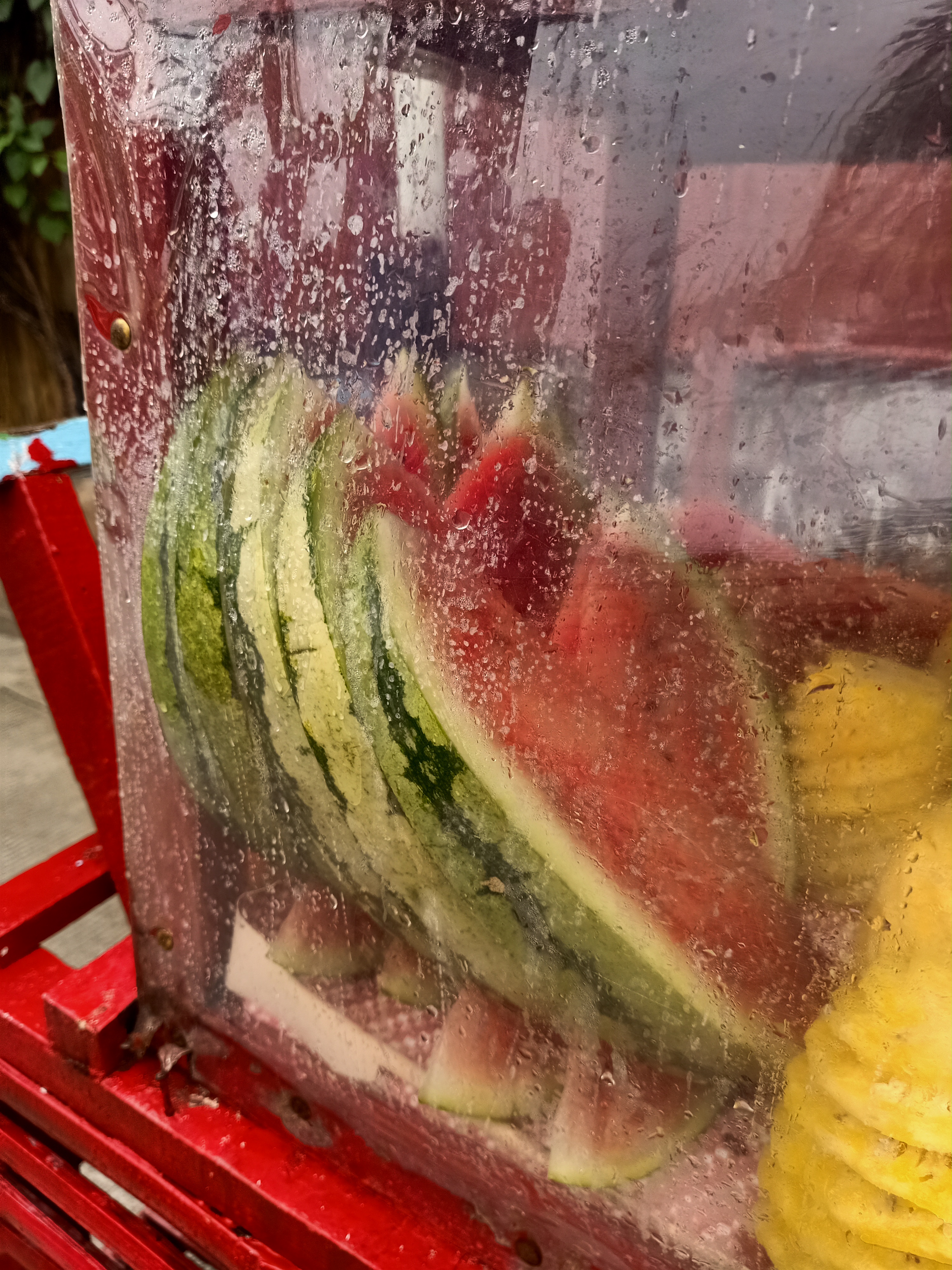 It is placed in a box covered with plastic ang have some ice inside to make it cold and fresh. He sells these watermelons for 20 pesos per slice. So delicious & so fresh watermelons waiting in my doorsteps.