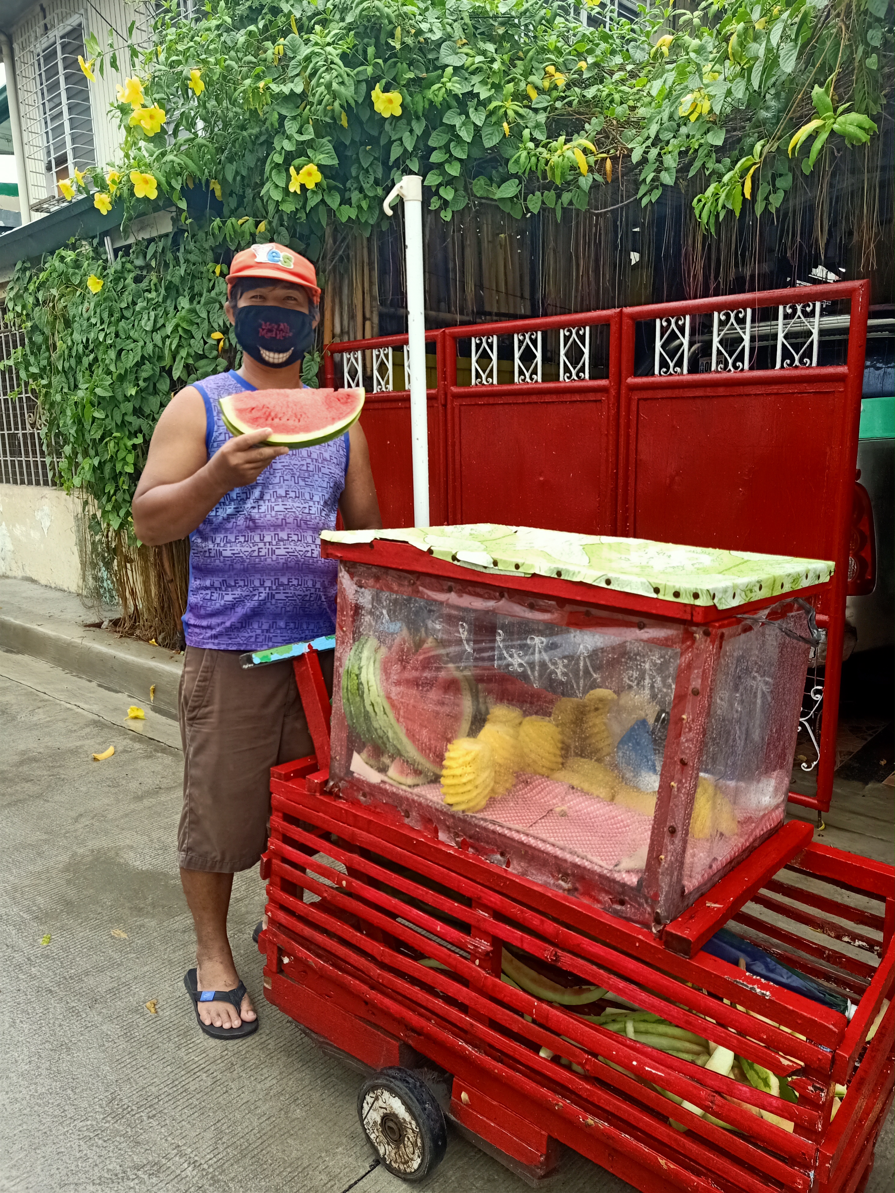 Thank God, I dont have to buy and look for watermelon in the market or fruit stands. It comes to me everyday through this man who sells them aboard his wooden cart. He goes around our streets everyday at around 11 am. Just in time to buy the watermelons and eat them after lunch.