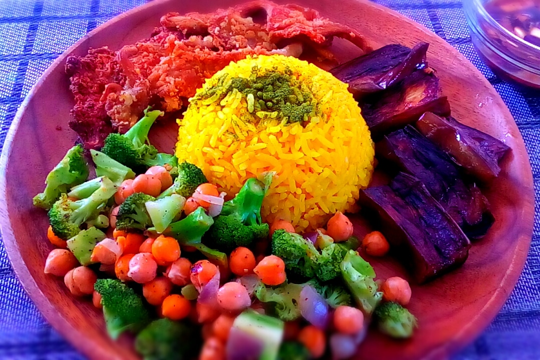 fried mushroom, fried eggplant, water-sautéed broccoli and chickpea, and turmeric rice with moringa powder