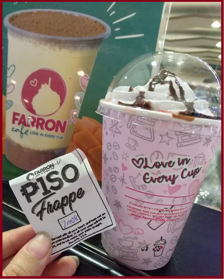 The promotion redemption of your P1so Frappe begins on April 17, 2019 at 12:00 AM GST+8 and ends April 25, 2019 at 11:59 PM GST+8 at Farron Café participating stores (check the app for participating stores).