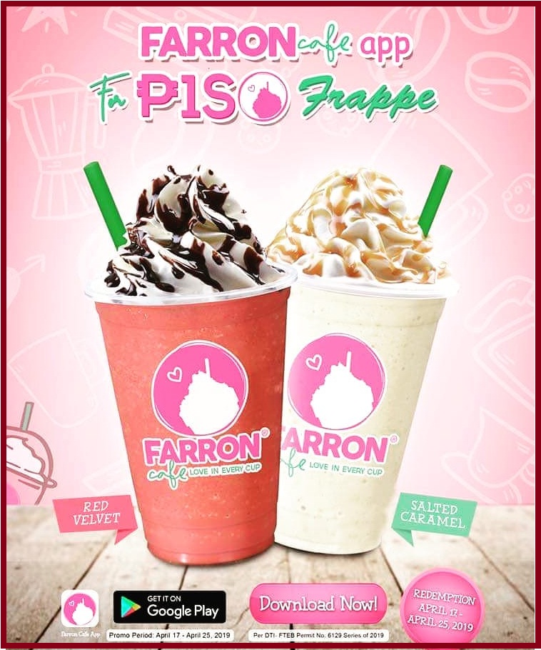 Download Farron Café app starting today, April 15, 2019 and get a chance to buy Farron Frappe for only P1so.