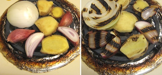 Char the onions and ginger: Using tongs, char the onions and ginger on all sides over high flame on a gas stove, or on a baking sheet placed directly under the broiler (about 5 minutes on each side) — until the onions and ginger pieces show charred spots. Rinse the pieces under cool water to remove any loose, gritty, overly charred bits.