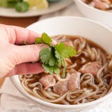 • Make-ahead moments: The broth can be prepared and kept refrigerated for 5 days or frozen for up to 3 months. The beef can be sliced and kept refrigerated for several hours (no longer than 24 hours). The noodles can be prepared, tossed with a bit of neutral-tasting oil, and kept refrigerated for up to a day before serving. The toppings can also be prepped up to a day ahead and kept refrigerated until serving.