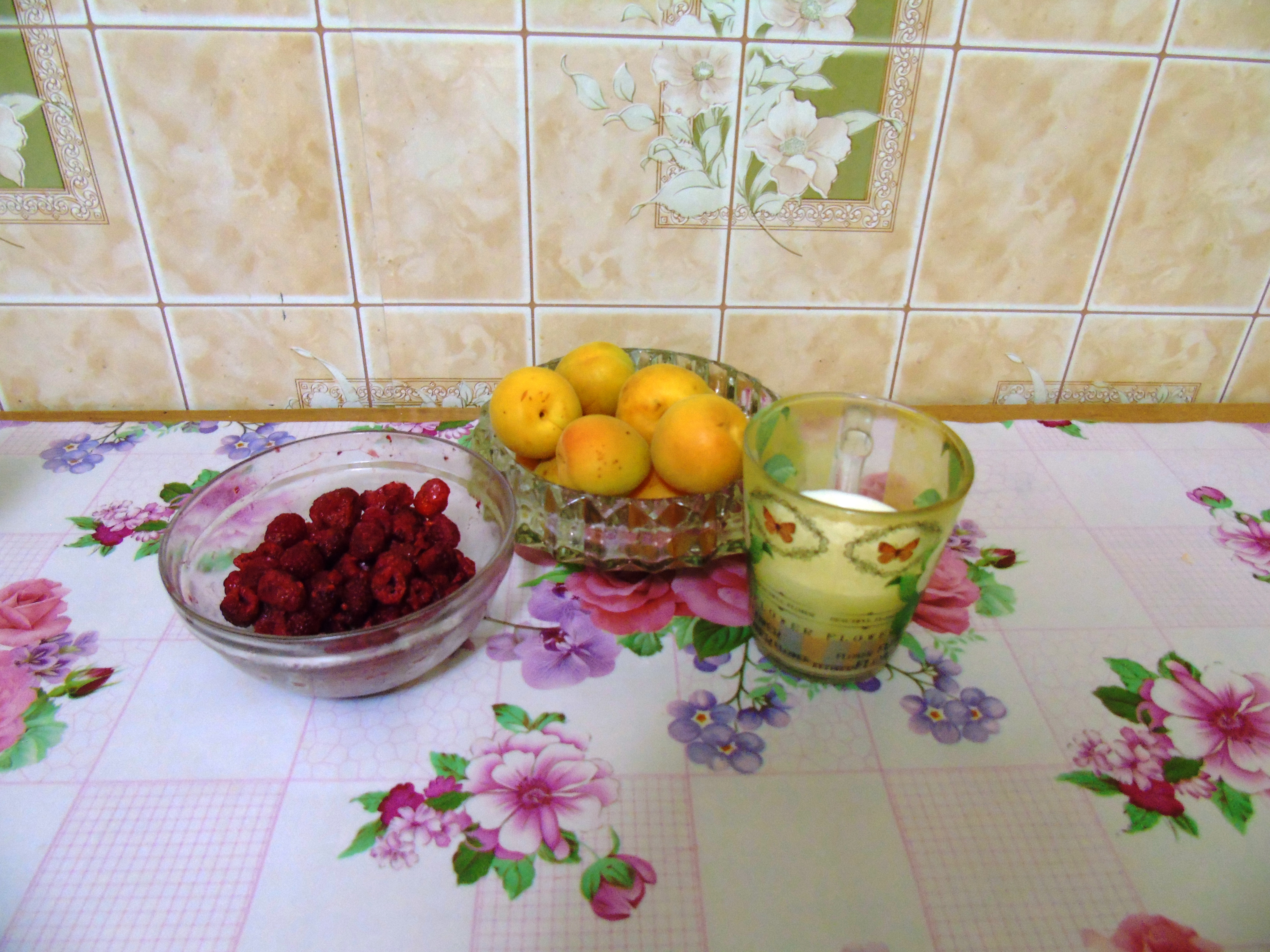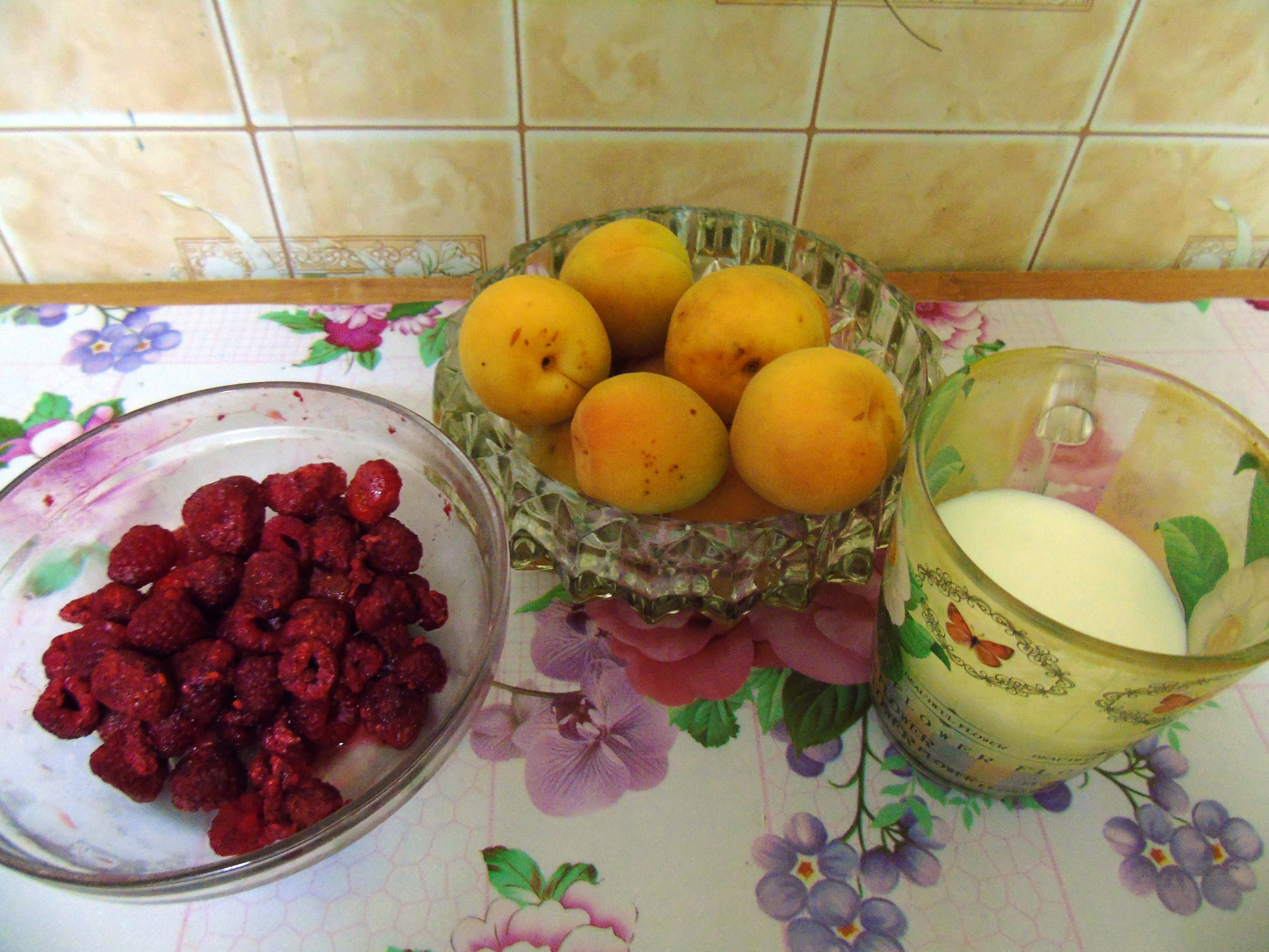 So let's start cooking. Ingredients: Apricots - 7 pieces, Raspberry - 100 - 200 grams, Milk - 150 -200 grams, Sugar - 1 tablespoon.