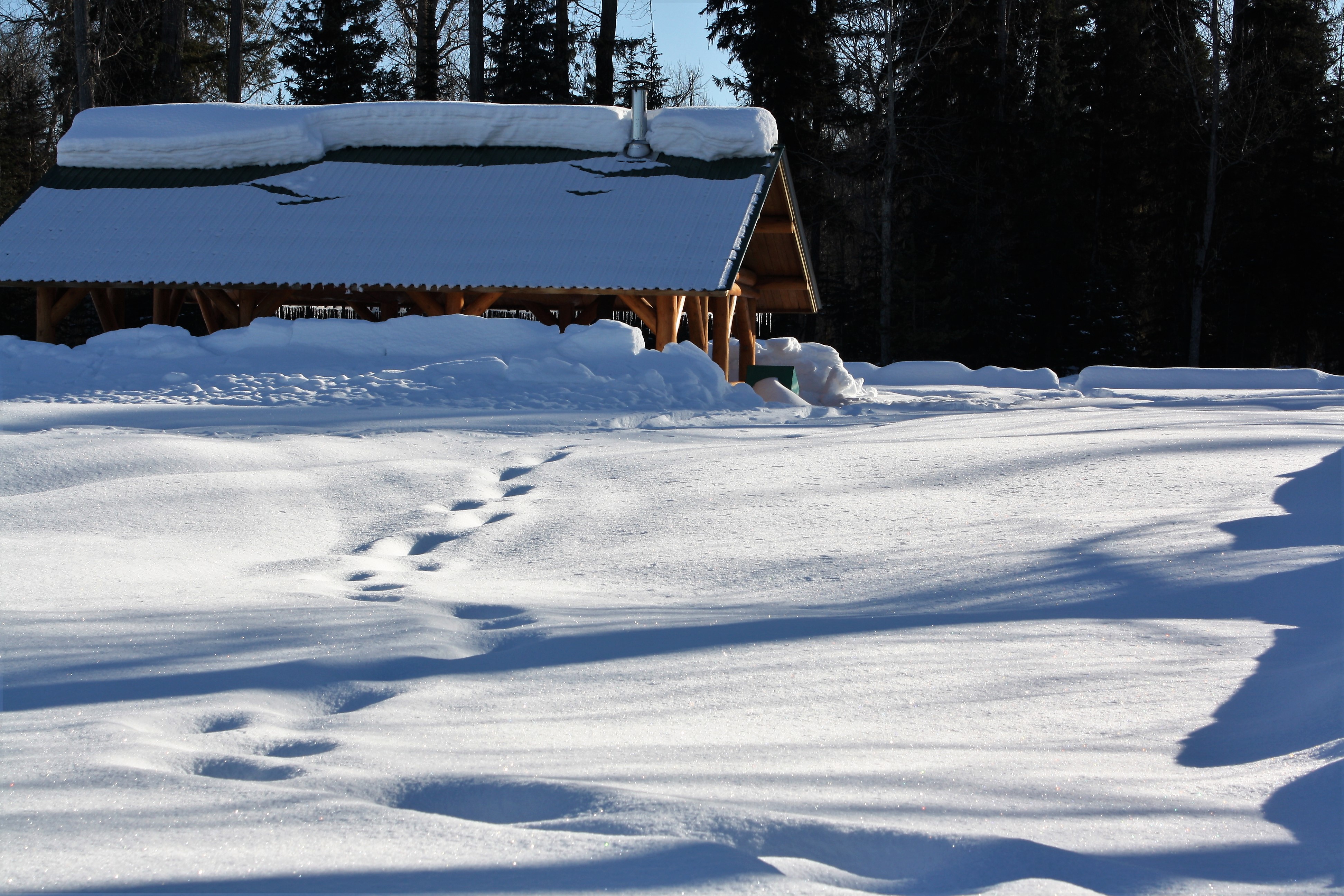 In the central interior of British Columbia, Canada, it is not uncommon for accumulated snow to reach six feet or higher throughout the season! This shot is of a log structure with deep footprints leading to it.