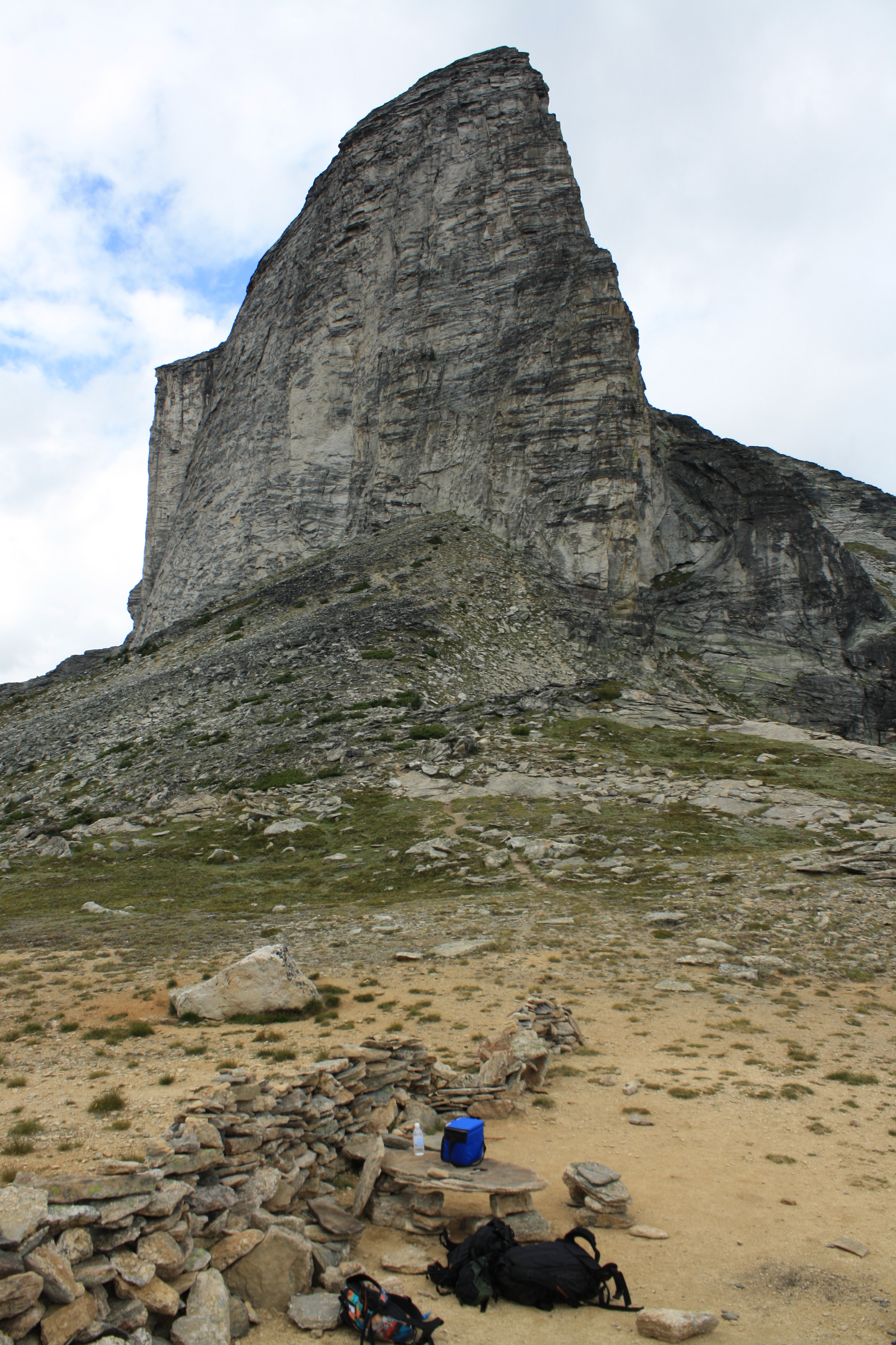 One of the many amazing geological features found on a hike in the Valhalla Mountains of British Columbia, Canada. The backpack and gear give some sense of how huge it is, but doesn't really do it justice. This cliff is hundreds of feet high!
