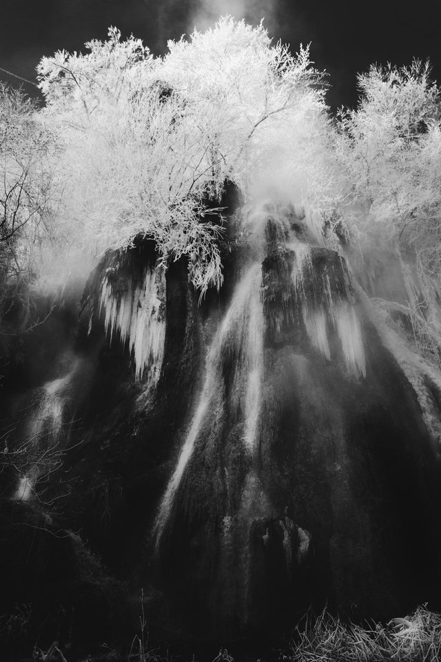 A long exposure infrared shot. The waterfall is called Brudslöjan or Skäktefallet, and is located on "Halleberg". At this time there were both ice and water which gave it a unique look. And some clouds were nice enough to pass by during the exposure :)