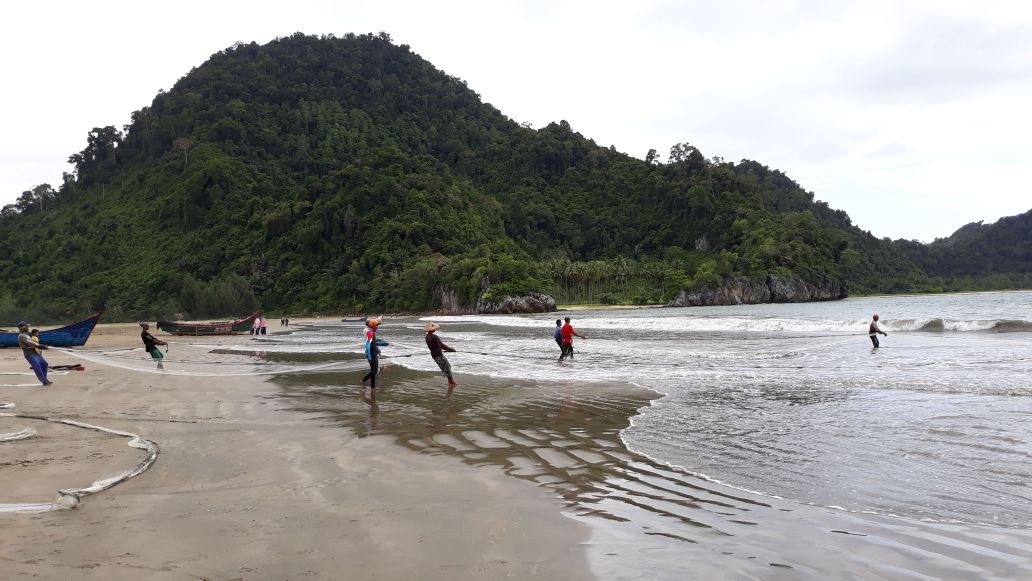 Setelah dilepas ke laut kemudian jaring diraik secara beramai-ramai ke darat.