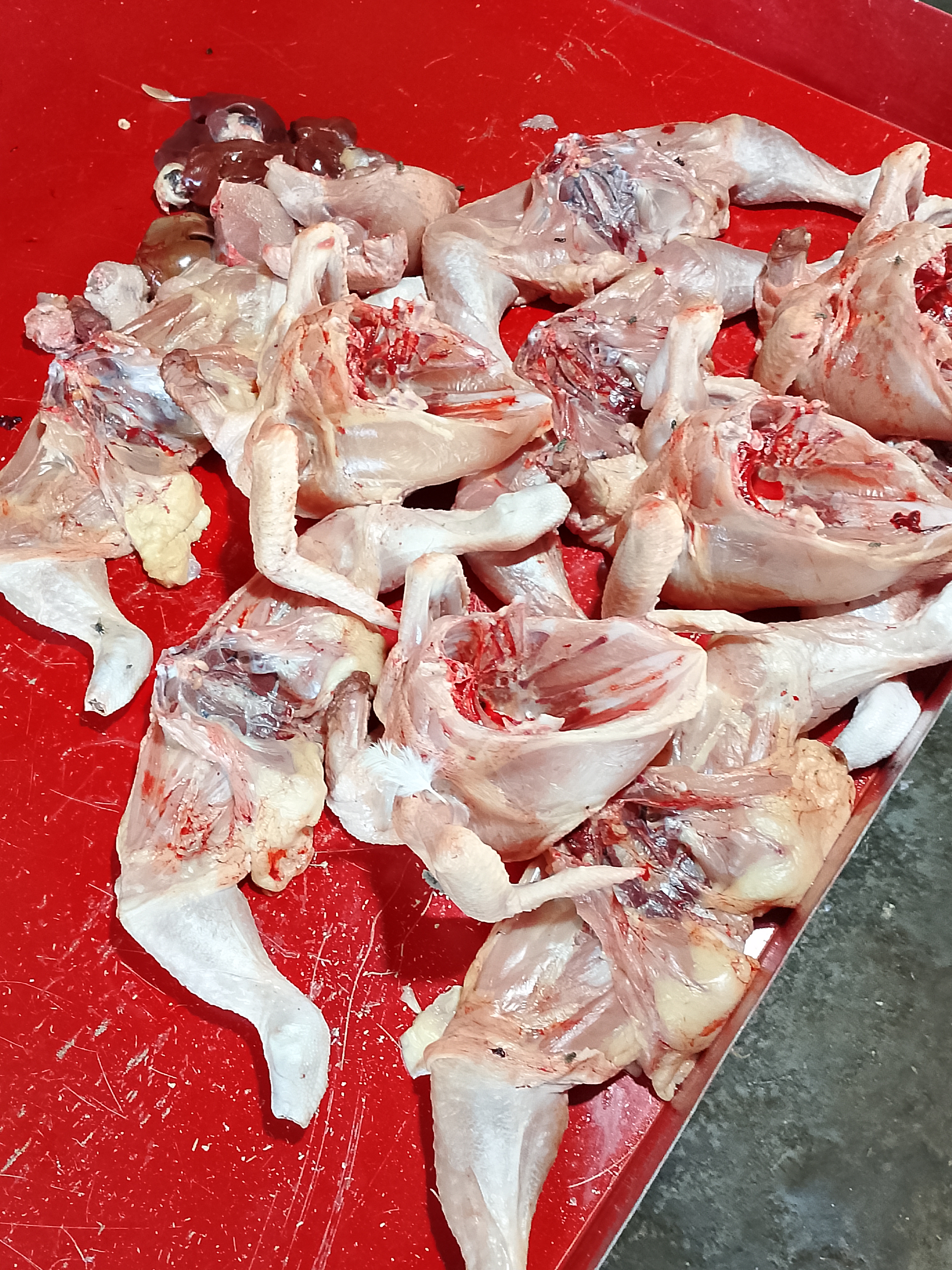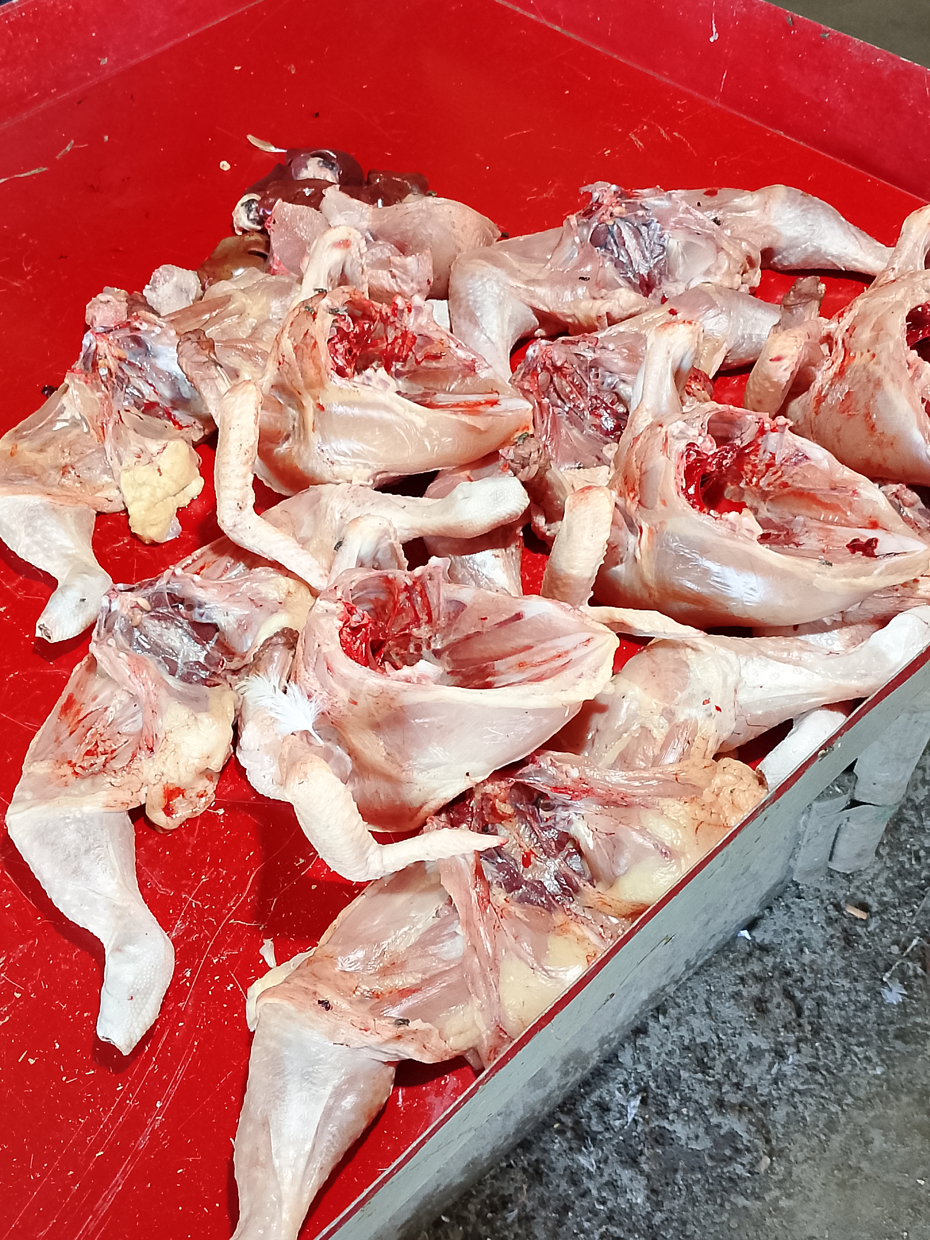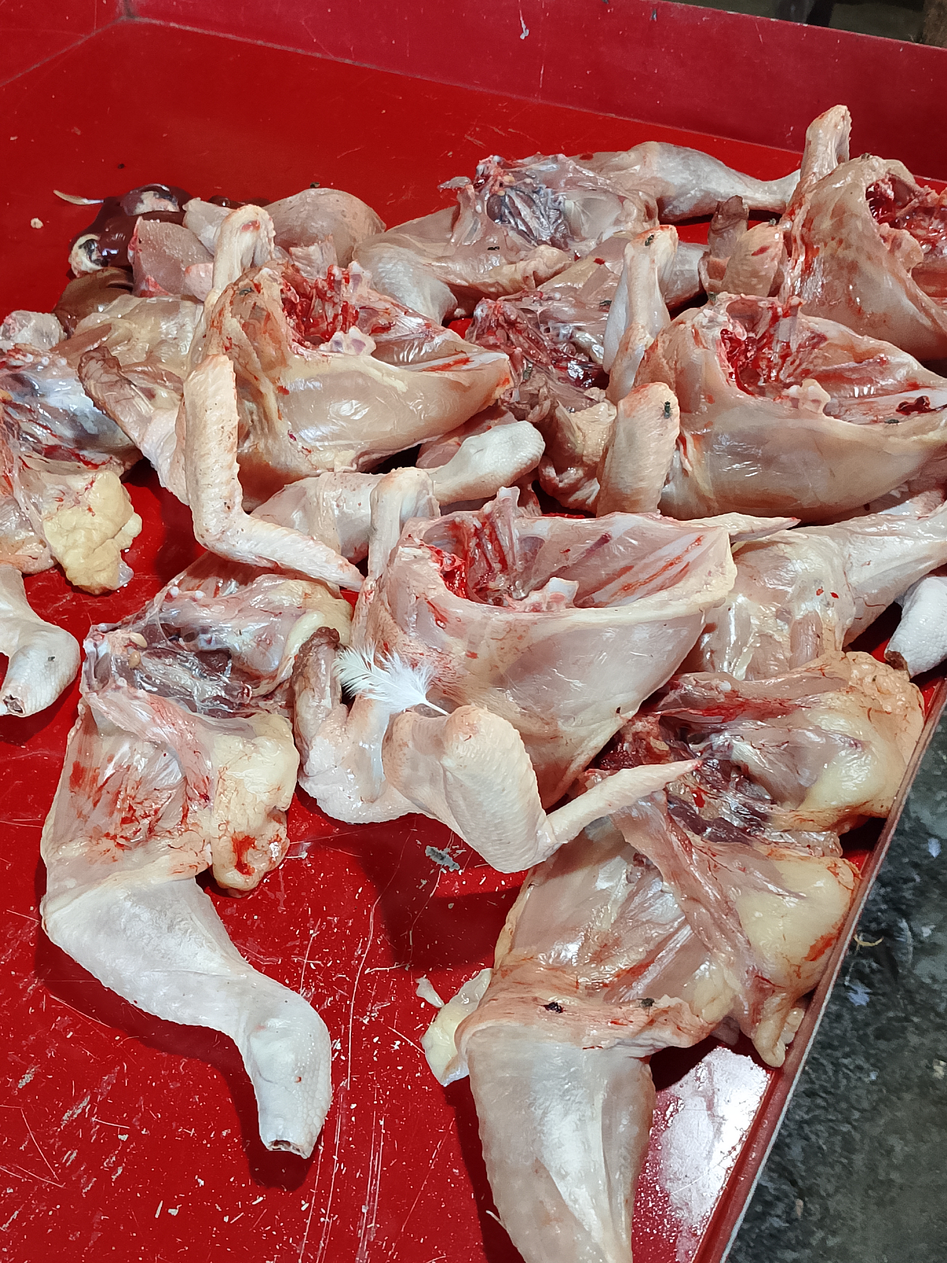 These are pieces of broiler chicken meat, sold in the market by weight. People buy them to cook at home, either for grilling or for making various dishes. We also went to the market early in the morning and bought some. The chicken was already cut and cleaned for us. It seems that broiler chicken is quite popular in Bangladesh and is commonly bought for cooking. I took another picture of the cut broiler chicken to share with you.