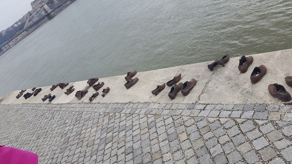 these shoes are in the memorial of those people who were killed by the Nazis during the second world war. they were forced to take off their shoes and were shot on the edge so their dead bodies fell off to the water and carried away by it.