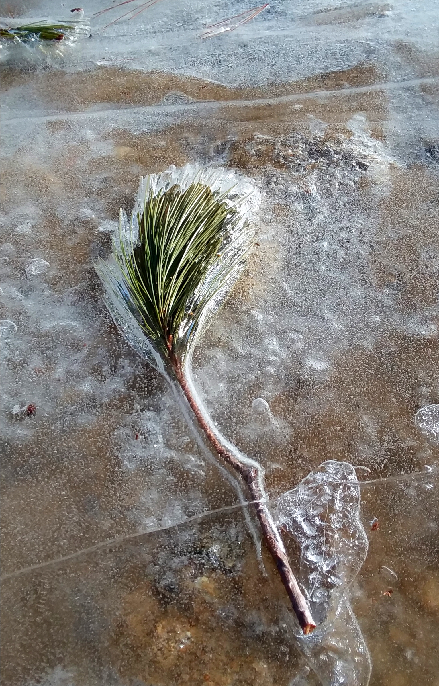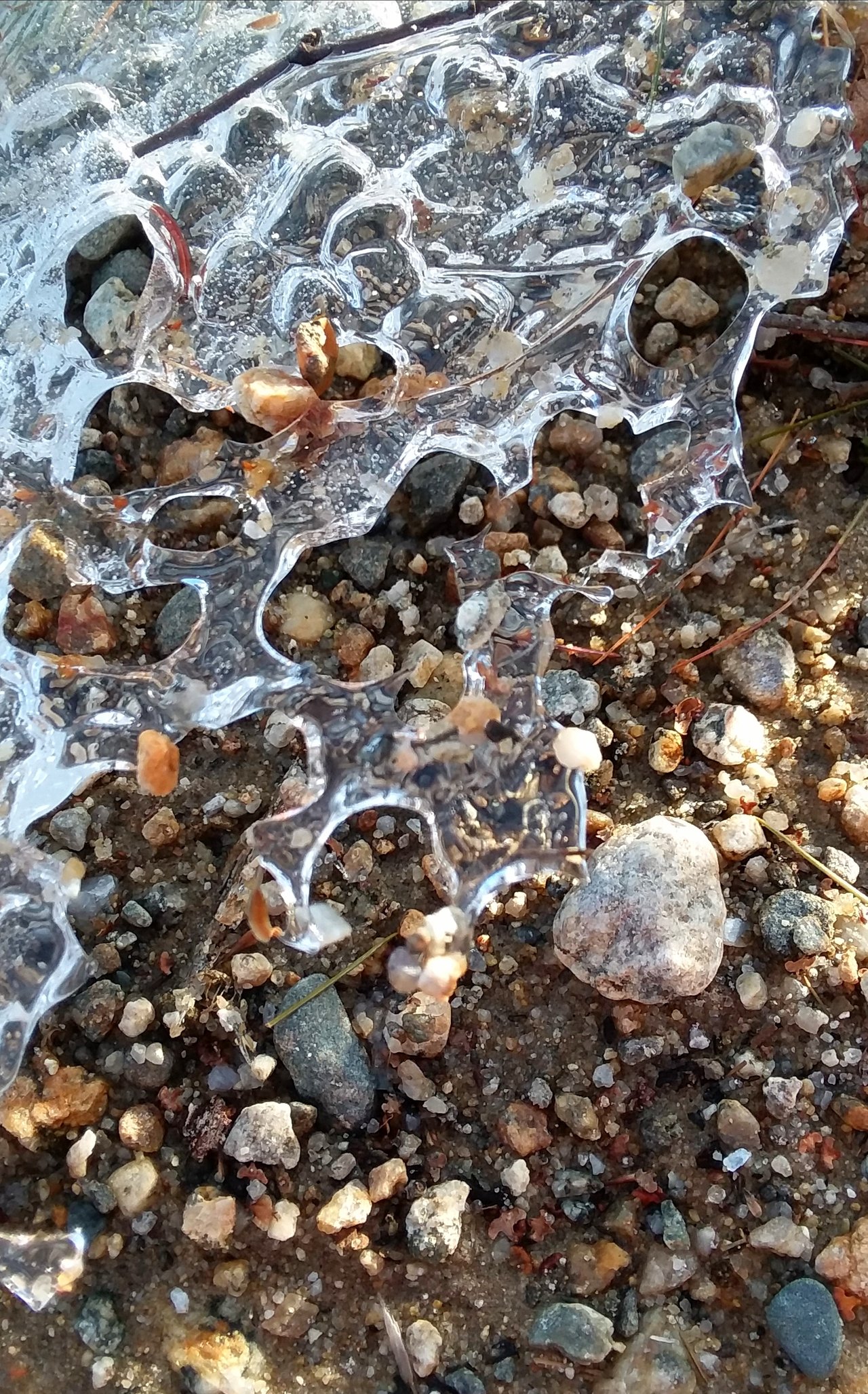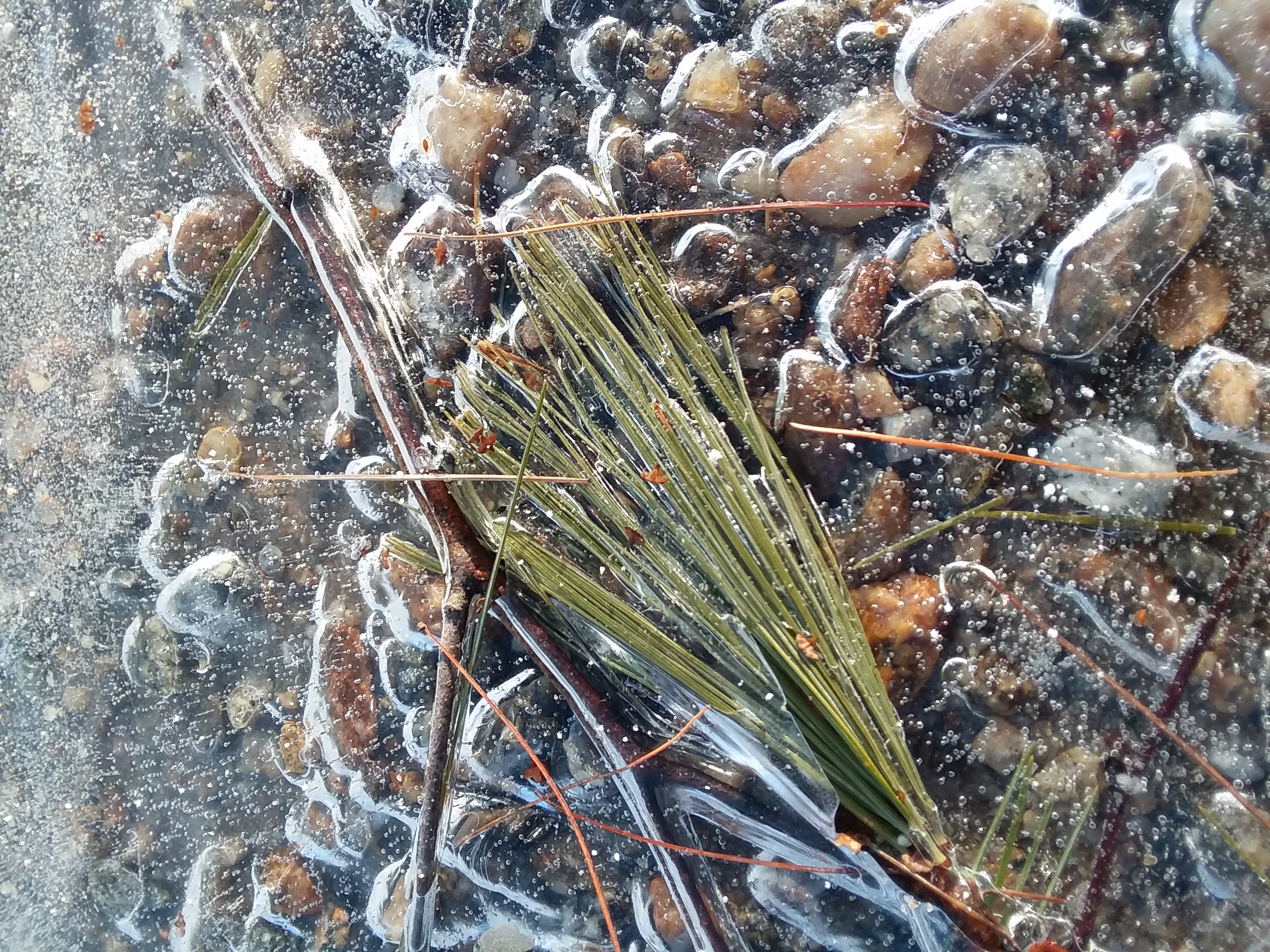 Stone pebbles, pine needles and ice.