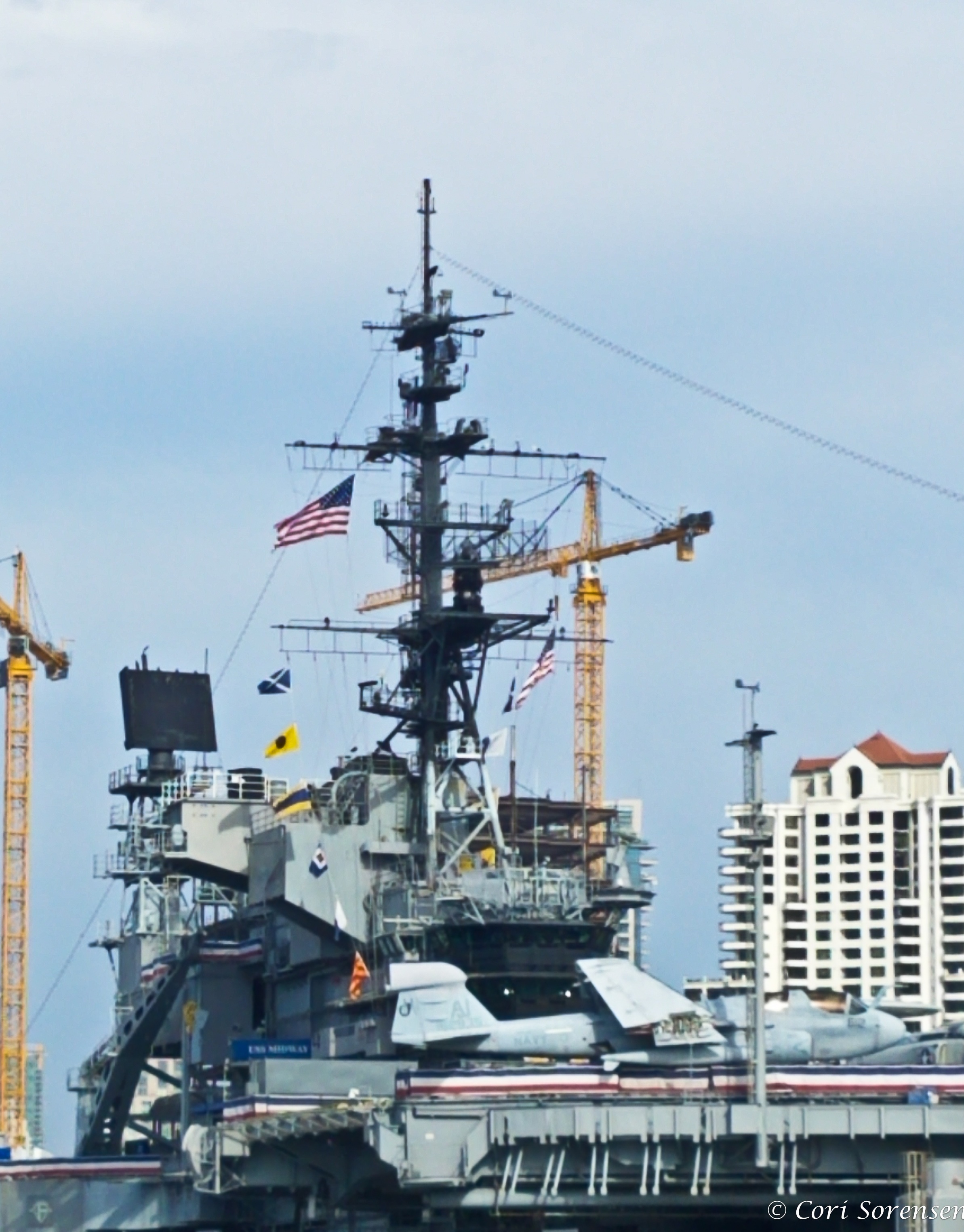 This is a view of the mast along with another aircraft carrier in front. I wouldn't want to be up there during a thunderstorm on the sea!