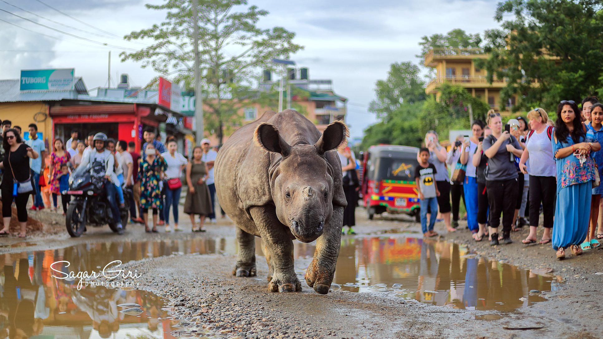 Rhino walking on the road at Sauraha, Chitwan National Park, Nepal. Many tourist watching & enjoying the moment !!