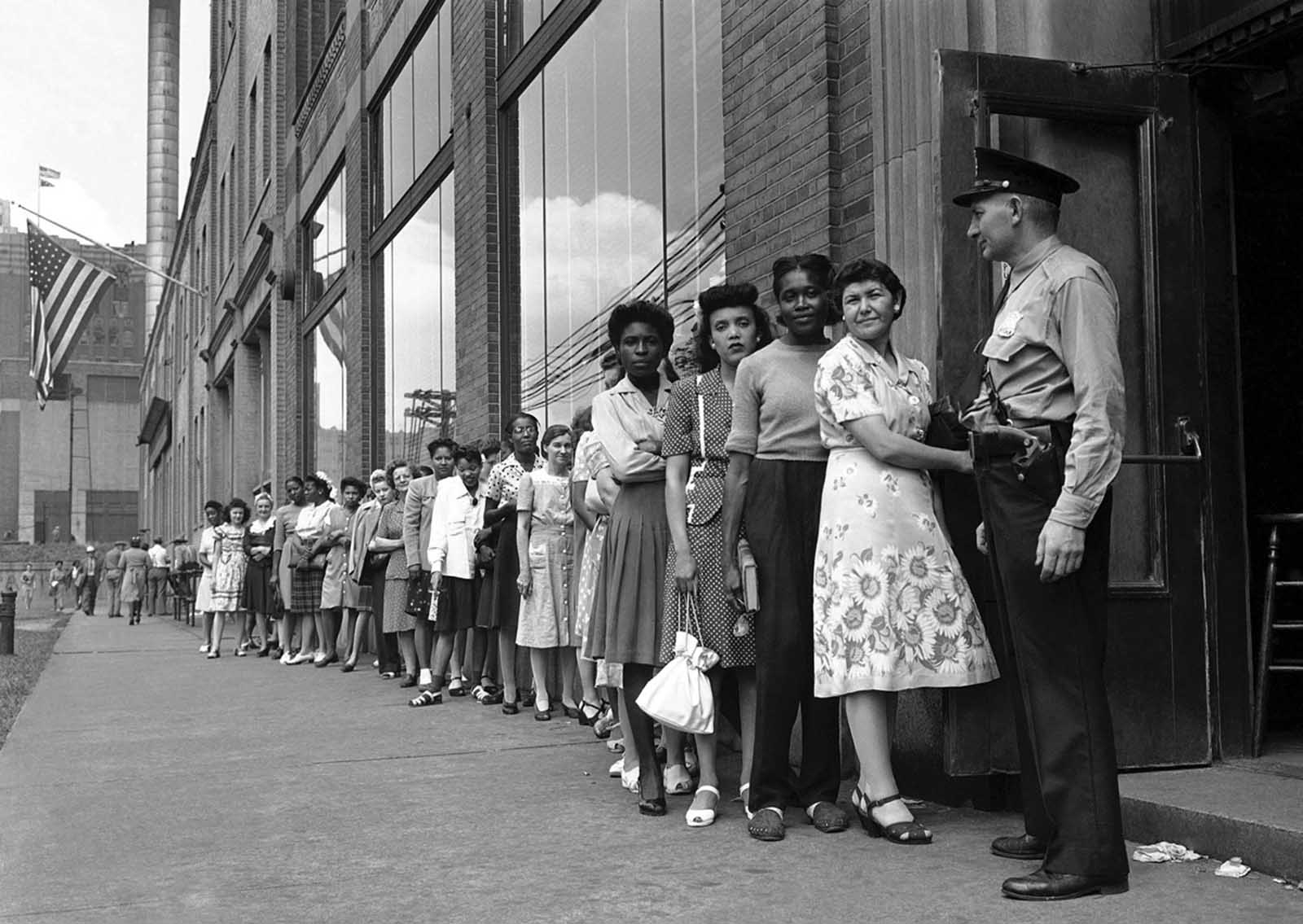 Men and women, formerly employed in defense work, crowd Detroit branch of War Manpower Commission to file claims for unemployment benefits and also register for new jobs on August 17, 1945.