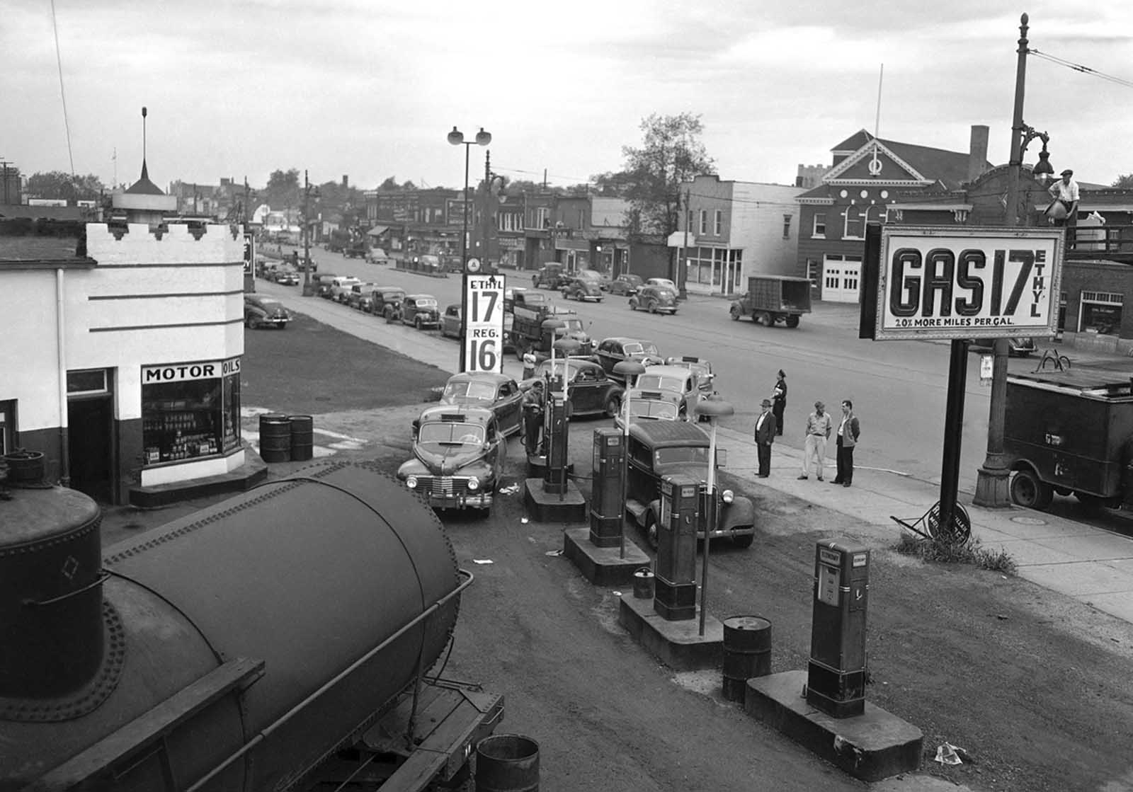 Motorists line a street waiting to buy gasoline at 17 cents per gallon at this station in Detroit on September 24, 1945.