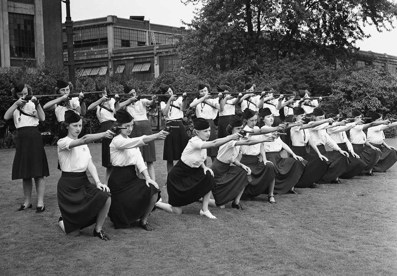 Female guards, placed on duty at the Naval Ordnance Plant, operated by the Hudson Motor Car Company in Detroit, Michigan, learn how to sight guns on August 7, 1942.