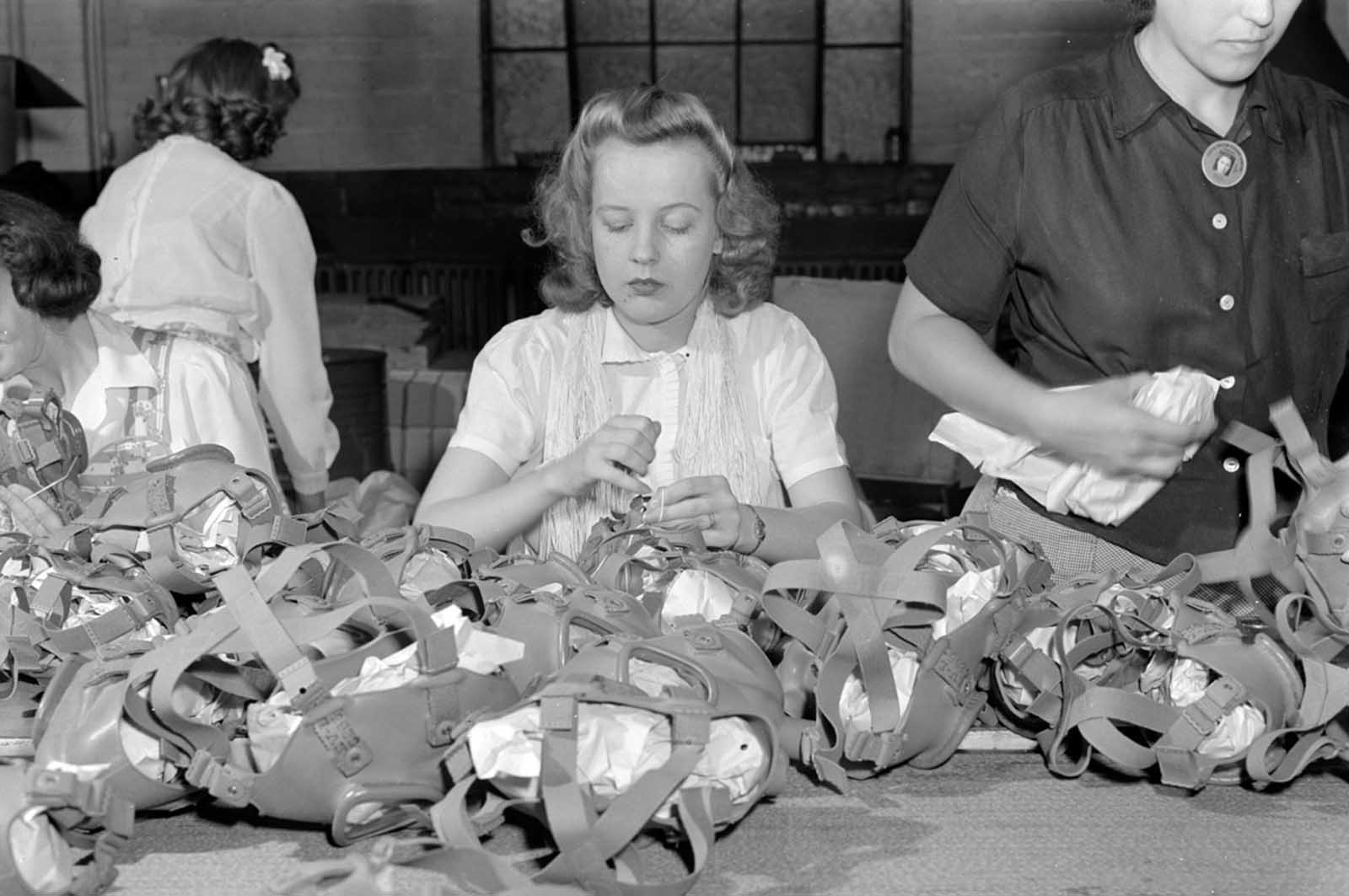 Gas mask production. Lacing head harnesses of gas masks after they have passed through all the stages of assembly and made ready for packaging, is the job of this young woman who works in the Eureka Vacuum factory which has been converted to war production.