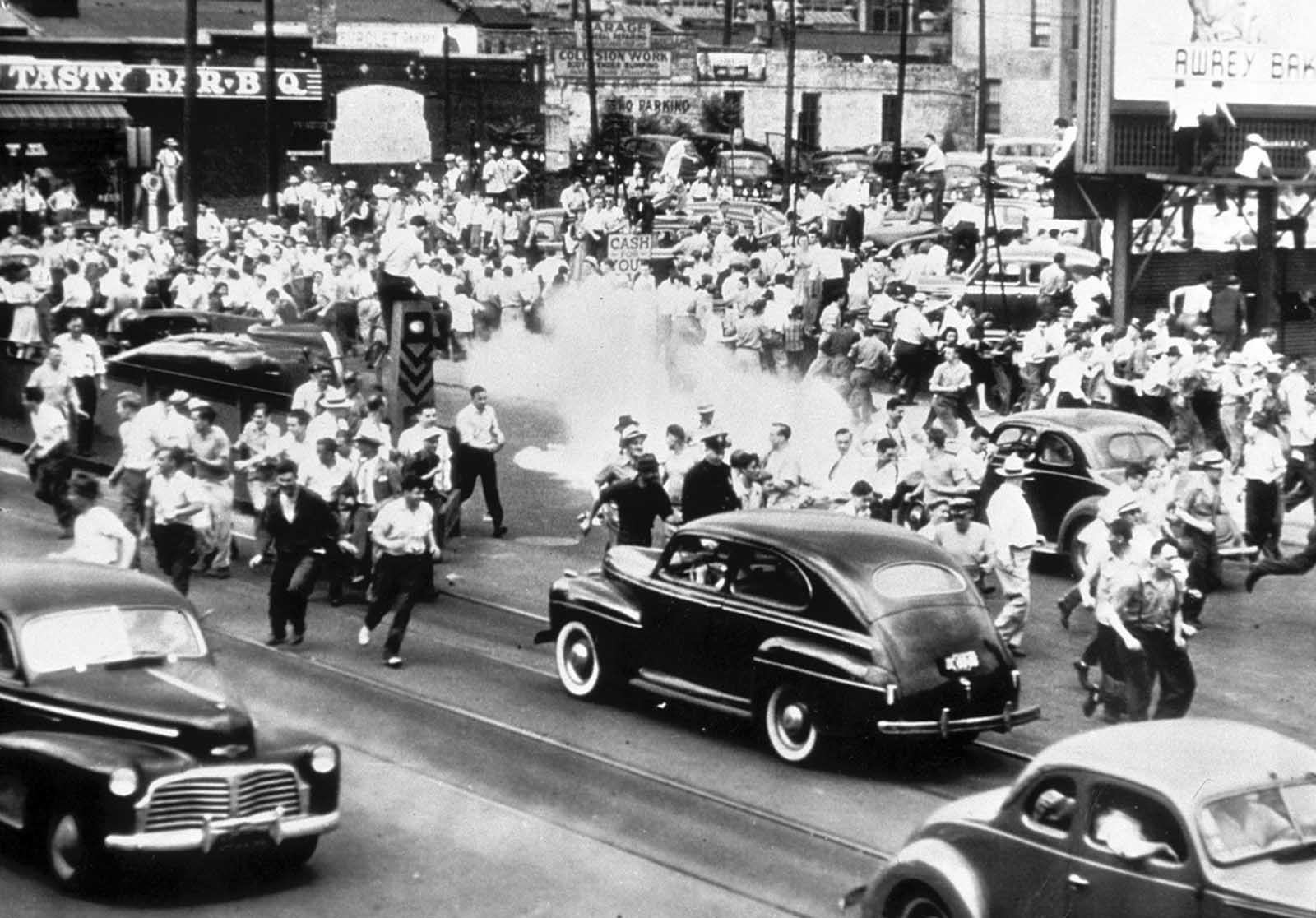Police use tear gas to disperse a crowd gathered on the main street of Detroit, Michigan, in an effort to halt race rioting on June 21, 1943.