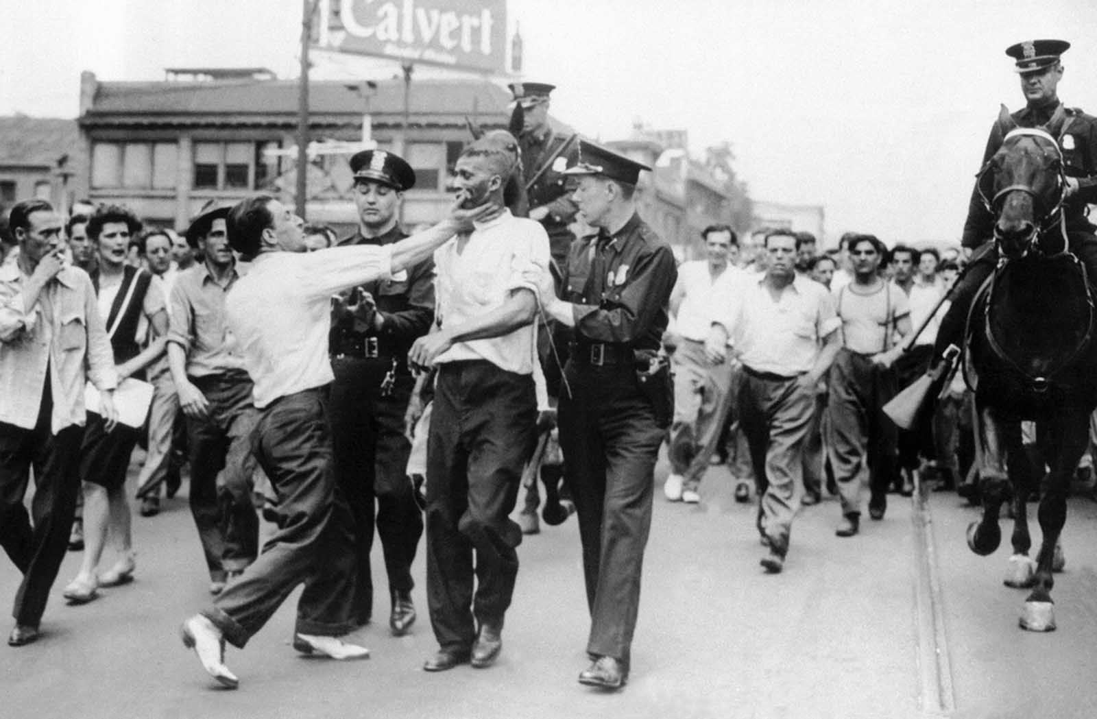 Police attempt to break up an incident as race rioting flared in the downtown area of Detroit on June 21, 1943.