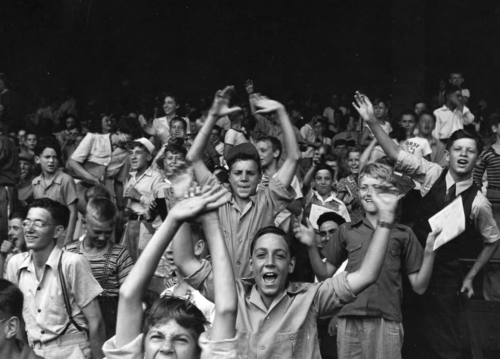 Kids at a ball game at Briggs Stadium, Detroit, August, 1942.
