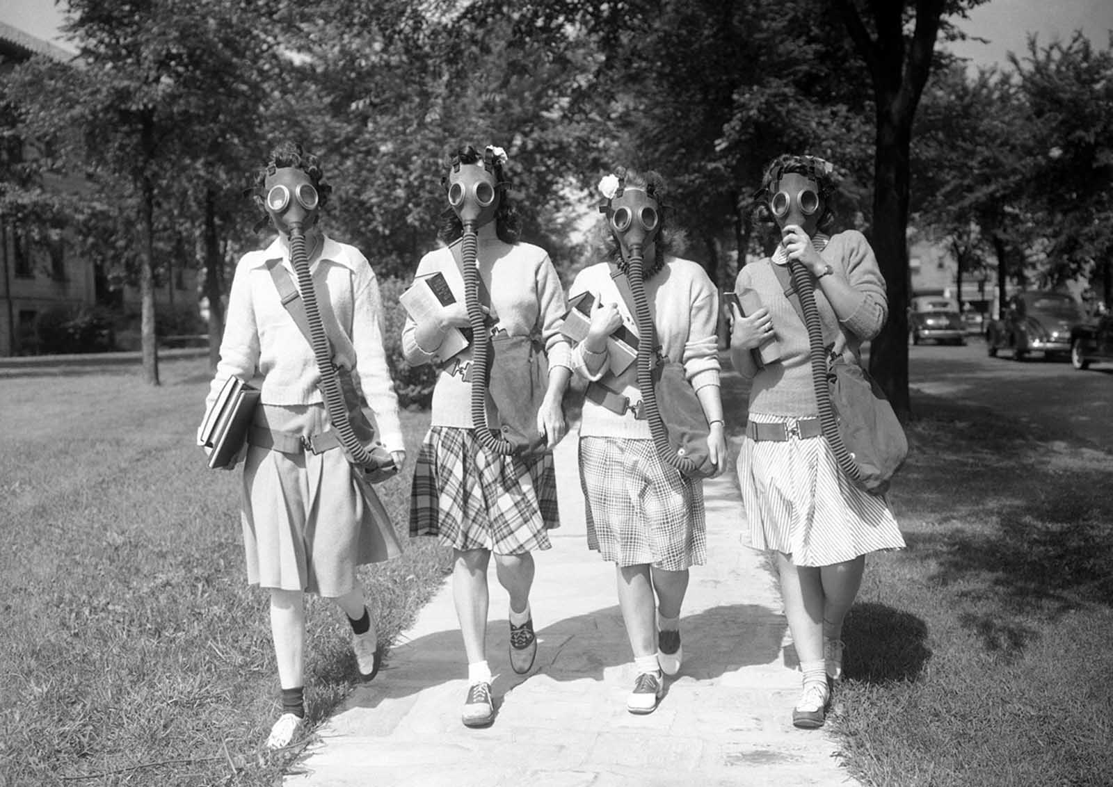 Looking ahead to the possibility that gas masks may some day be a necessary part of their ensemble, these University of Detroit students were trying out masks in a practice drill on the campus on June 23, 1942.