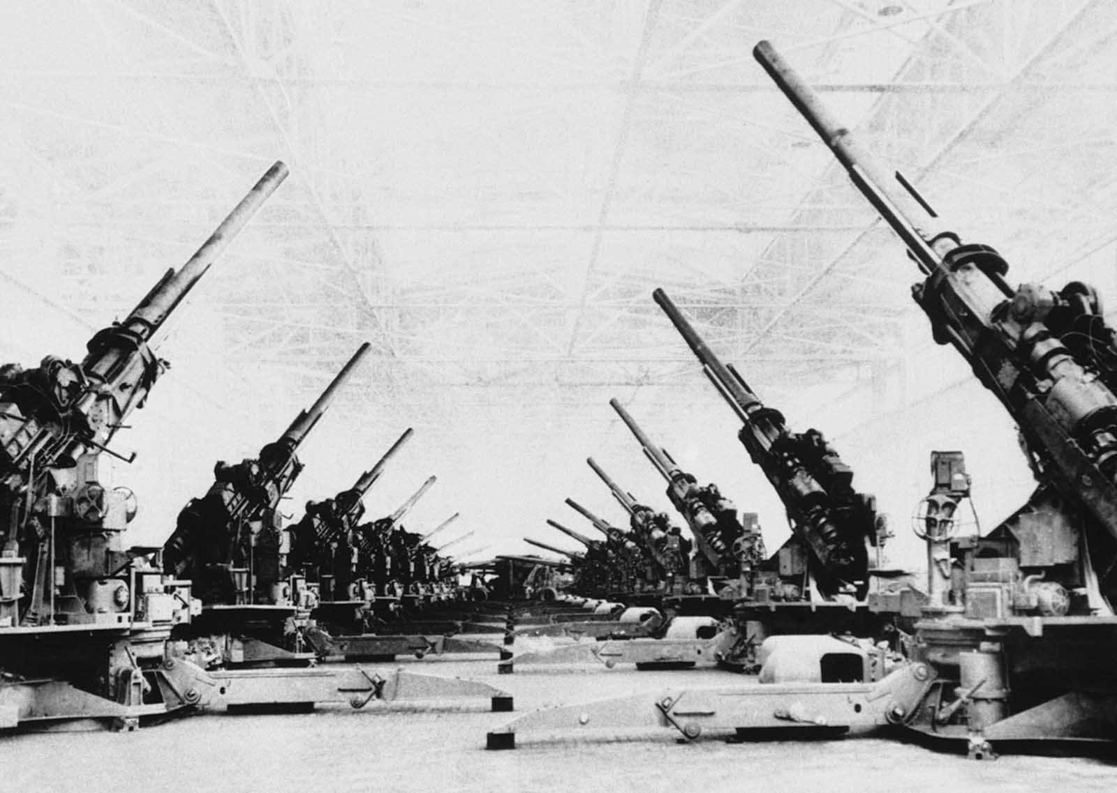 Huge anti-aircraft guns, the U.S. Army’s new powerful Stratosphere guns, are lined up in the final assembly area of the Grand Rapids stamping division of Fisher Body in Detroit on June 1, 1944, prior to shipping.
