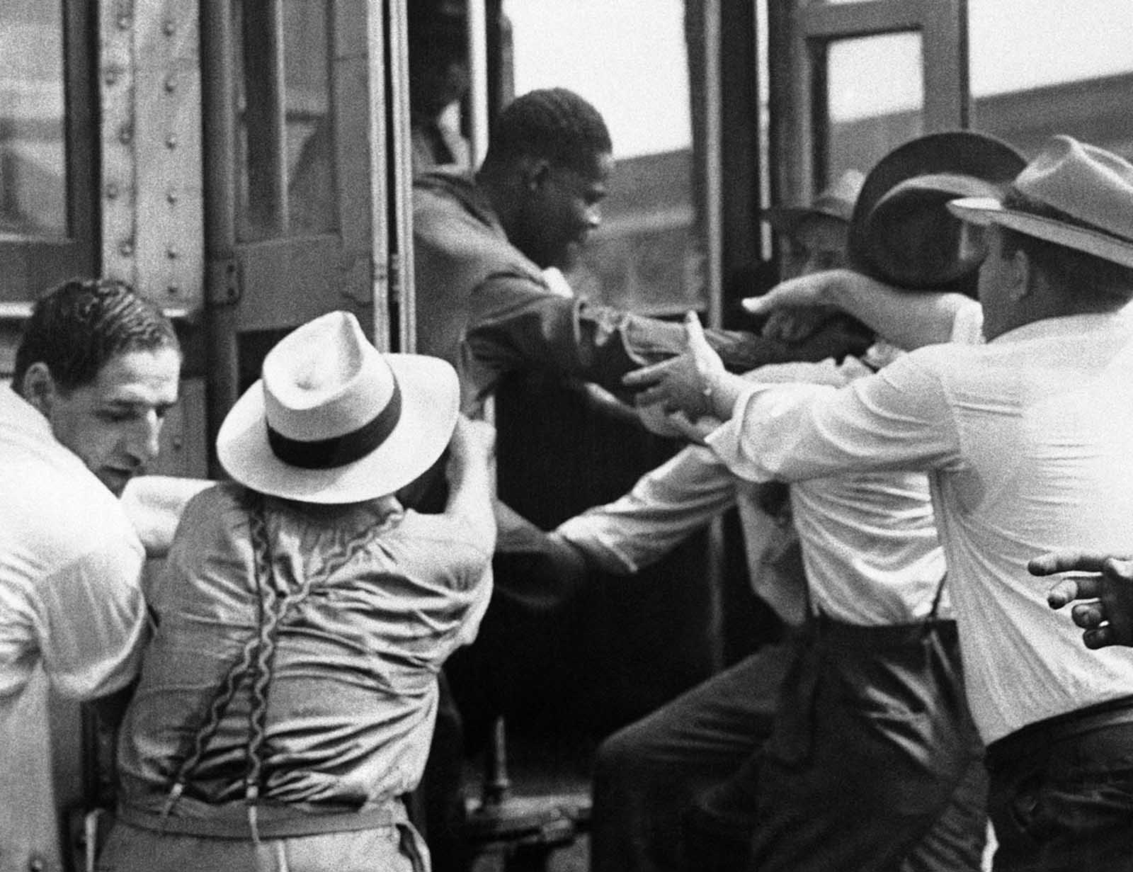 A man is dragged from a street car on June 21, 1943, during fighting near Detroit’s downtown section.