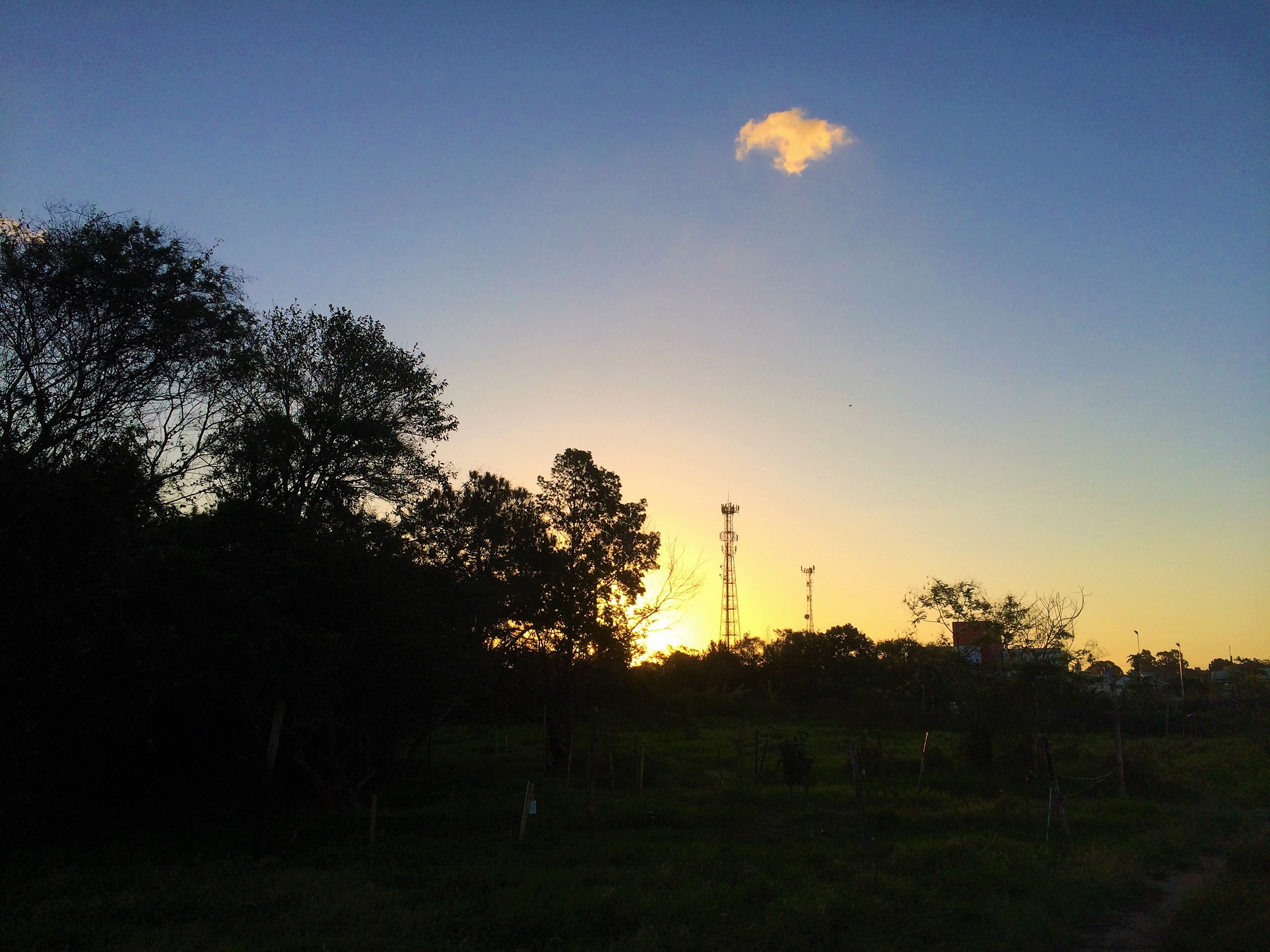 ...silhueta das árvores, torre de telefonia e pequena nuvem solitária no céu.