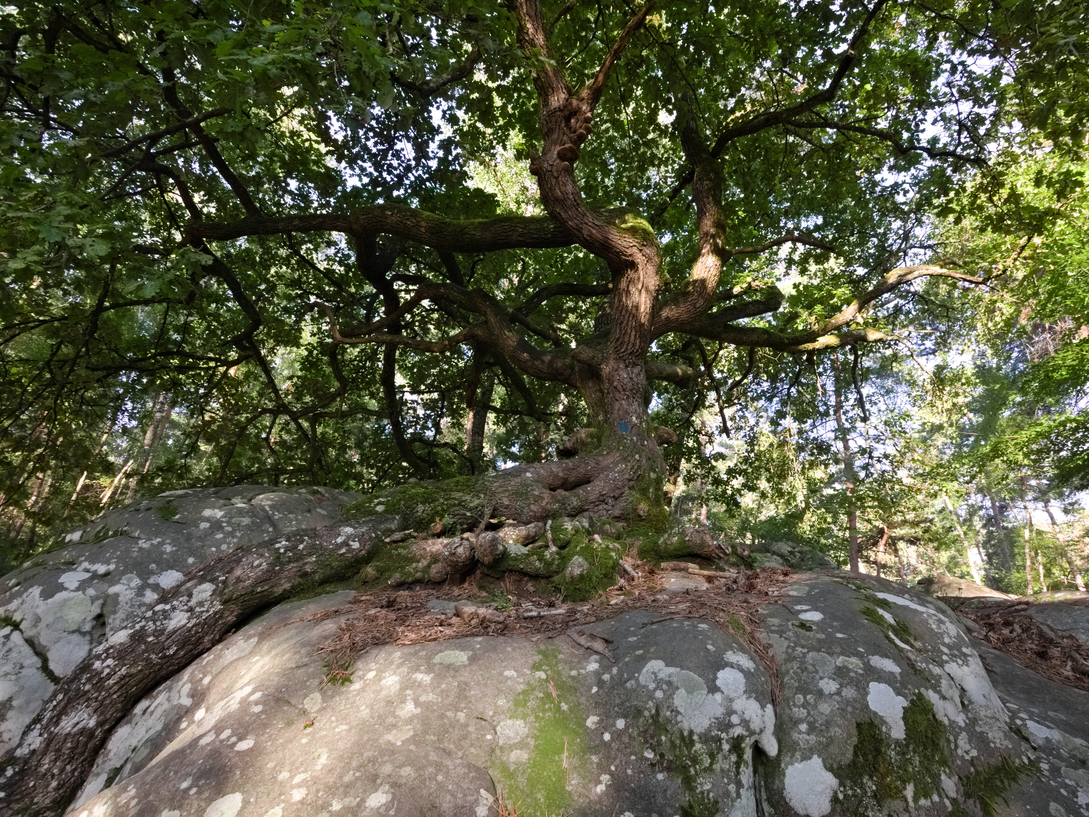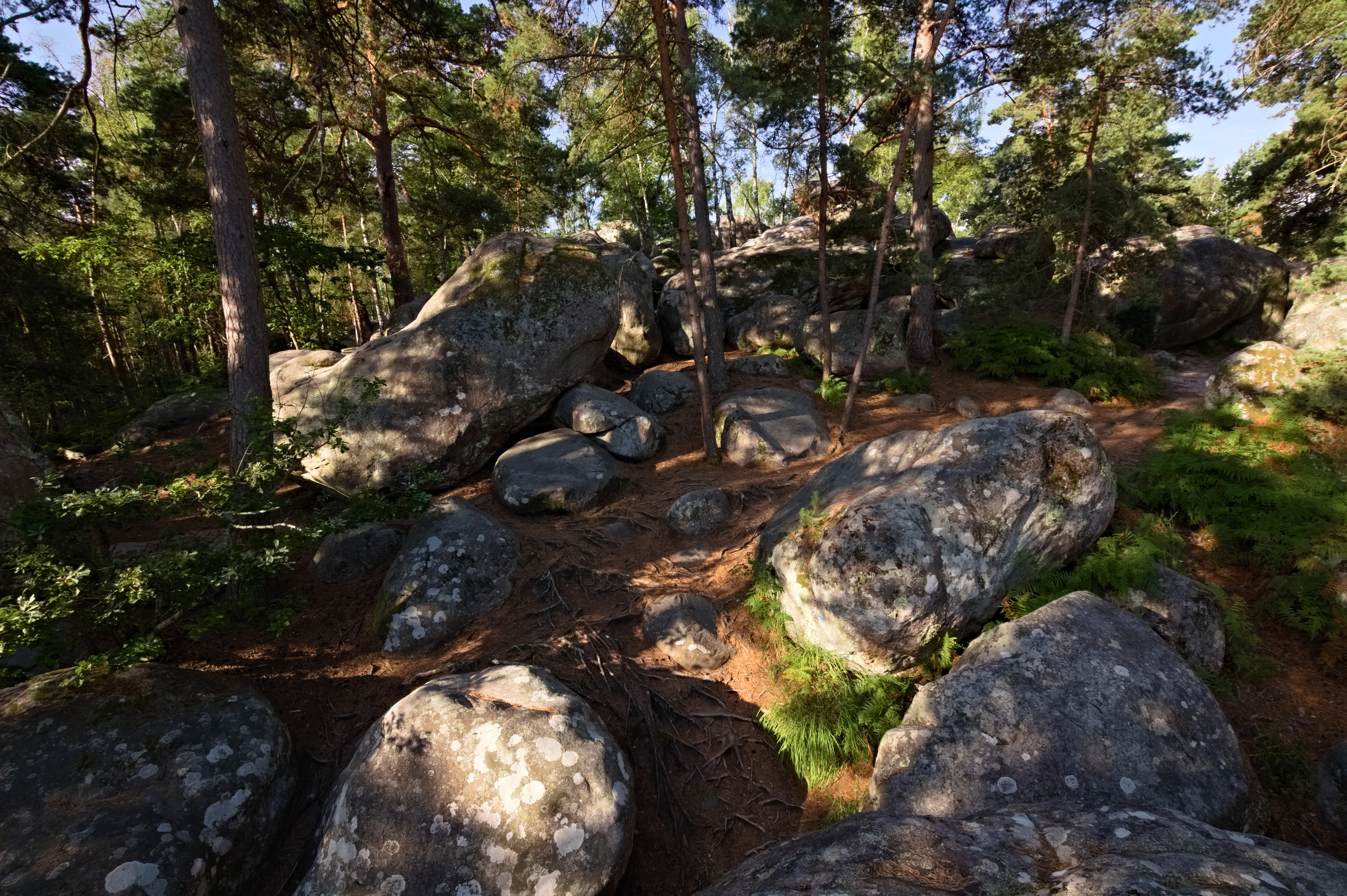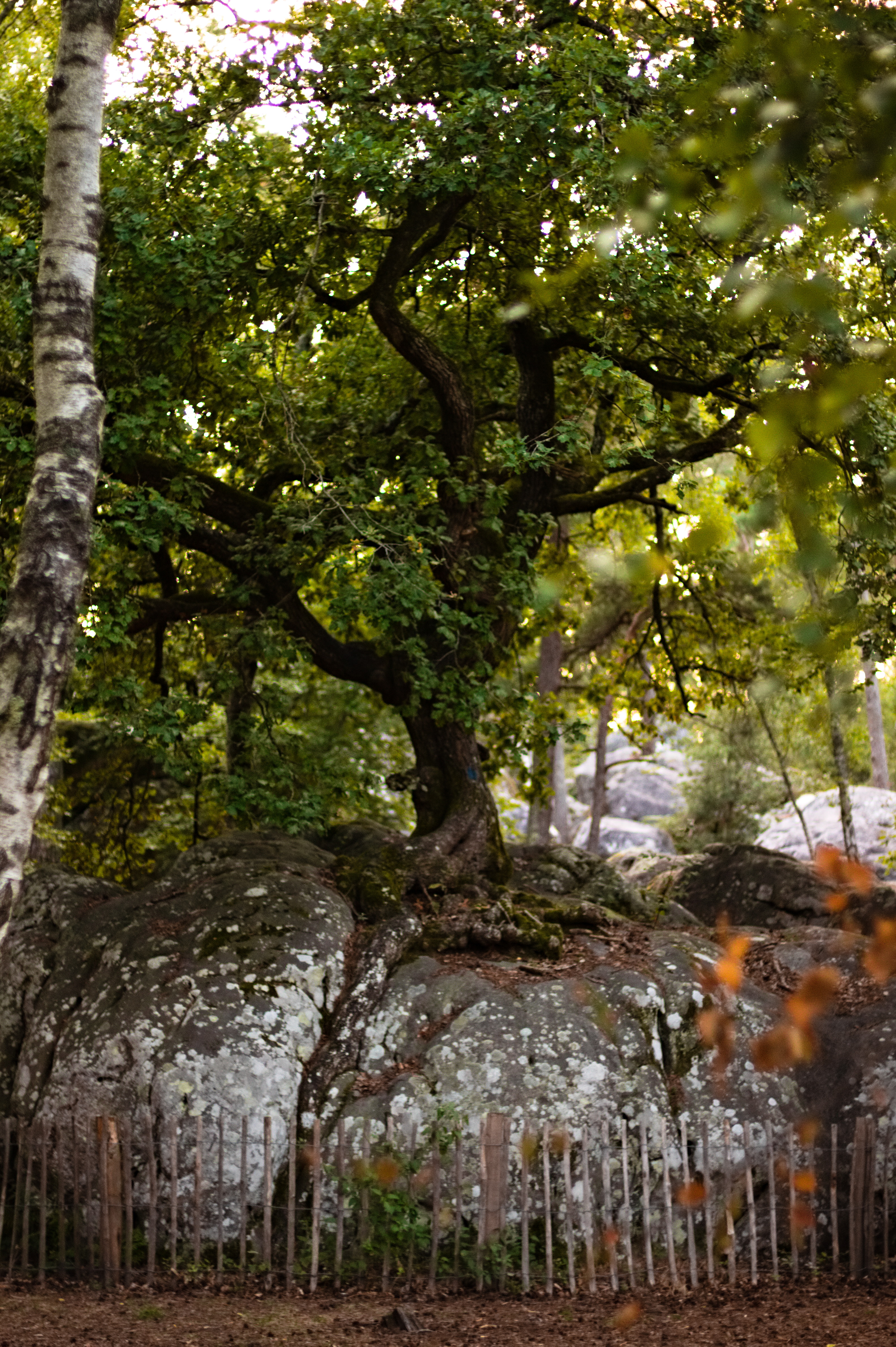 Today I wanted to share some of the photos I took shortly after we arrived in the forest of Fontainebleau about 50km south of Paris. We spend almost the whole day bouldering in a sector called Rocher Canon. It is a big scetor with lots of boulders which are all located around or ontop of a small hill. The forest is more dense here than in other parts. Mostly oaks, birchs and pines are growing and often with a thick carpet of ferns underneath. A hiking path leads over sandy soil or log paved paths through the maze of boulders. It bends around almost every boulder so one can discover all these crazy sandstone figures along the path. At one point you even have to crouch underneath two leaning rocks. Right at the beginning of the sector, there stands one big oak. It grows directly on one of the first sandstone boulders, reaching down into the soil with one gigantic root.
