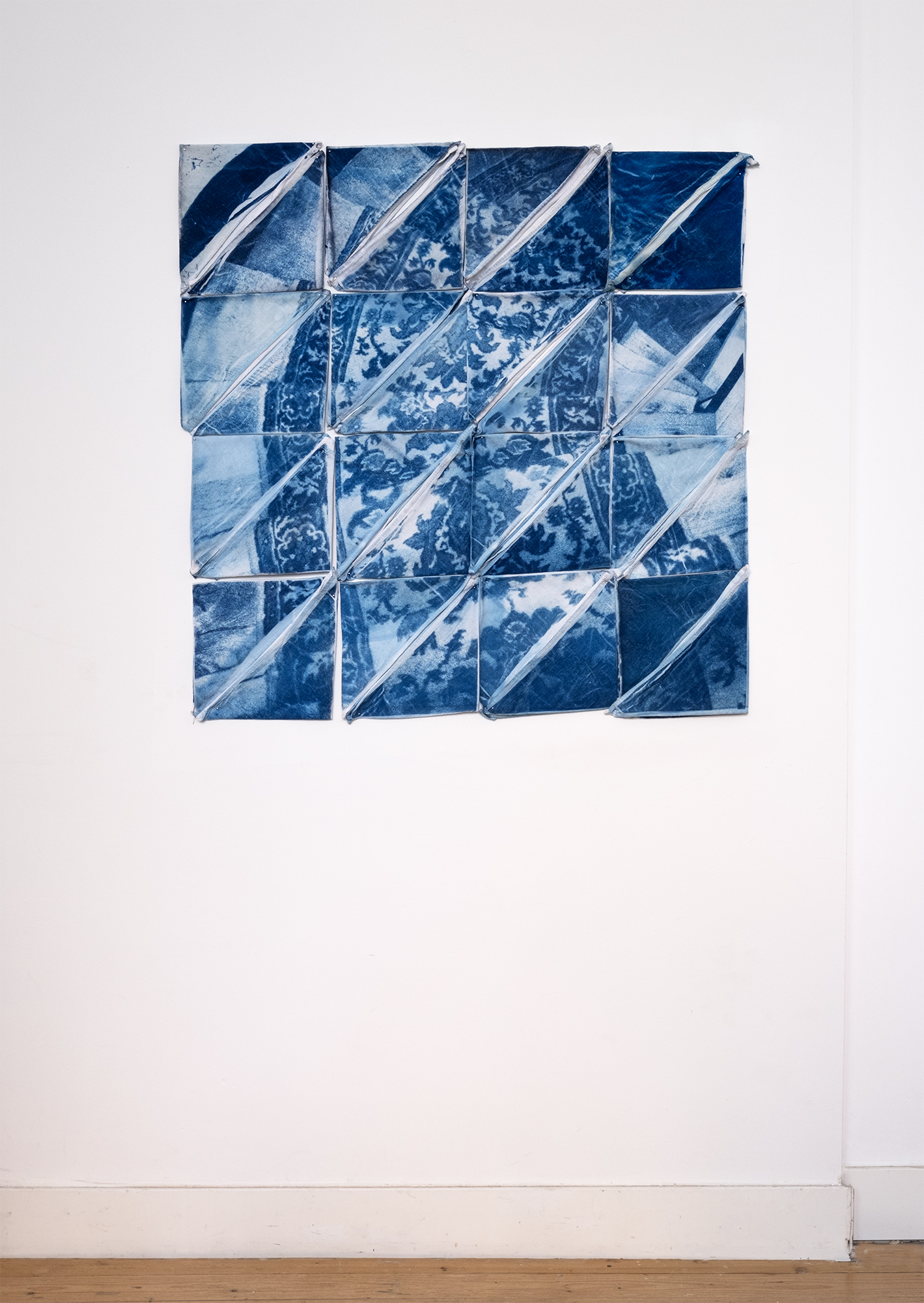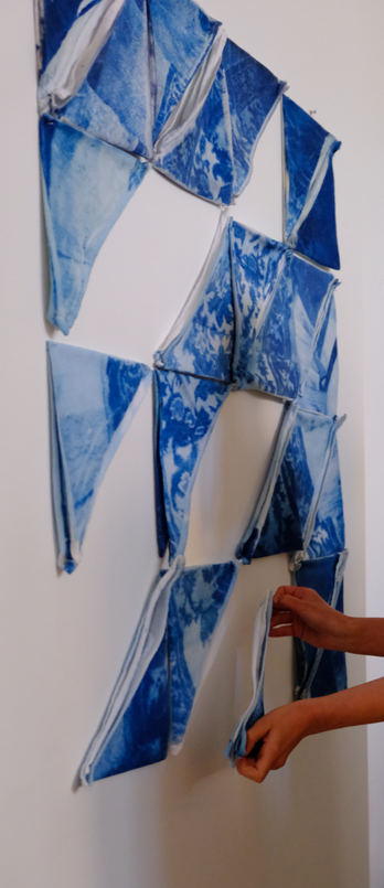 The process I've just for this work is called cyanotype. The image is taken analog, developed, but then turned into a digital negative. This negative is used on top of the coated napkins. Cyanotype is a mixture of chemicals that react to UV light. After exposing them to UV light you wash the prints in water to fixate the image. So are alle the parts handprinted.