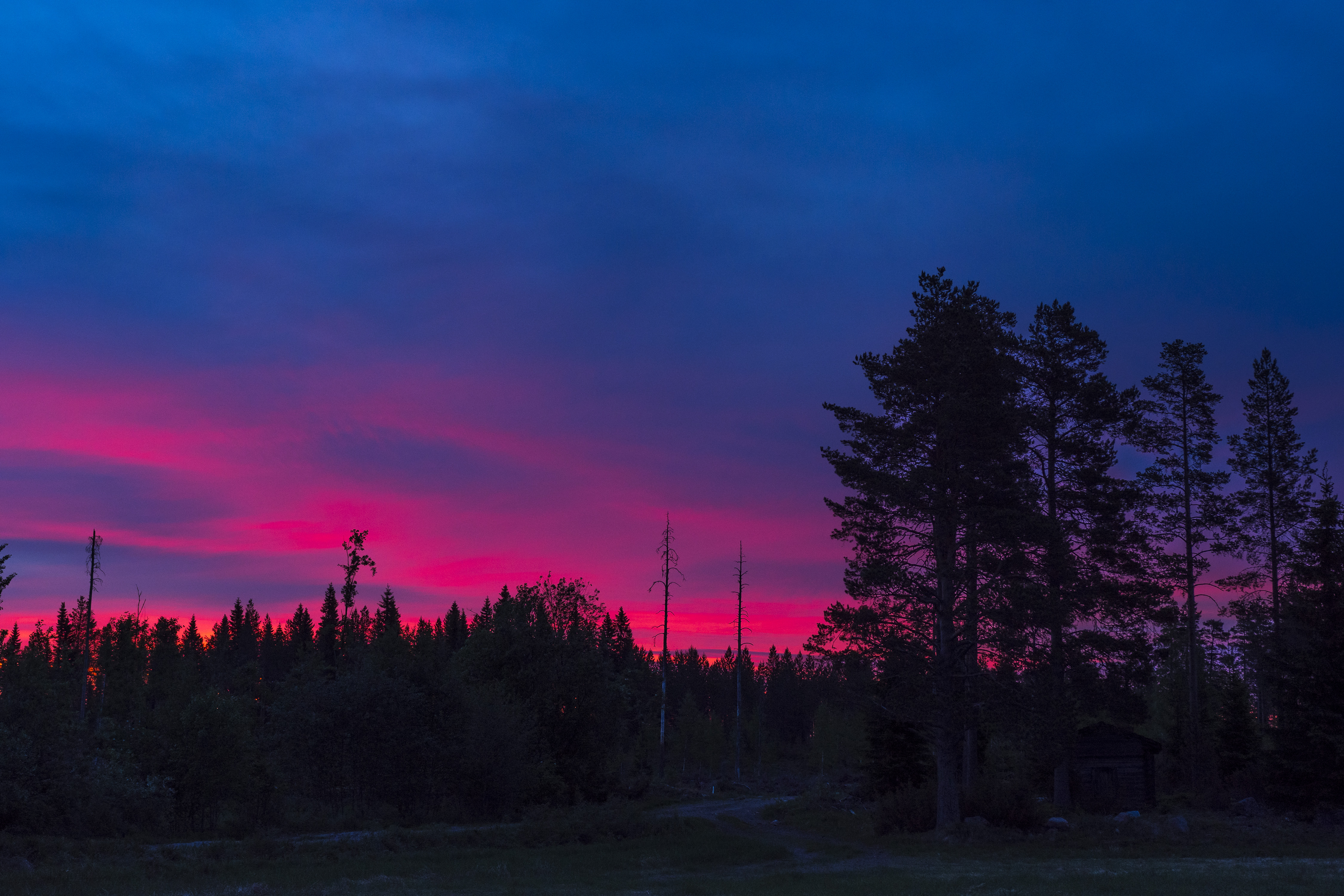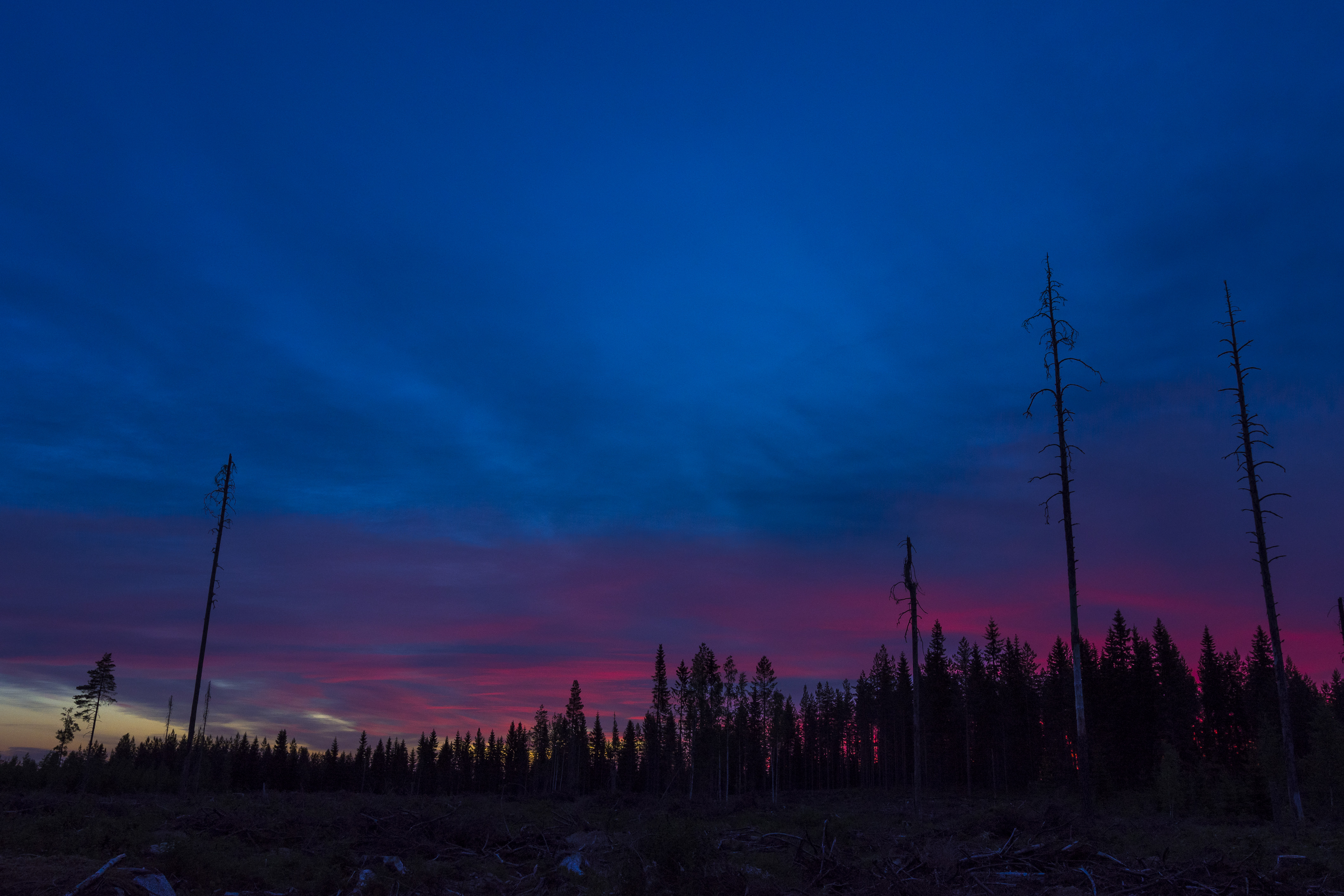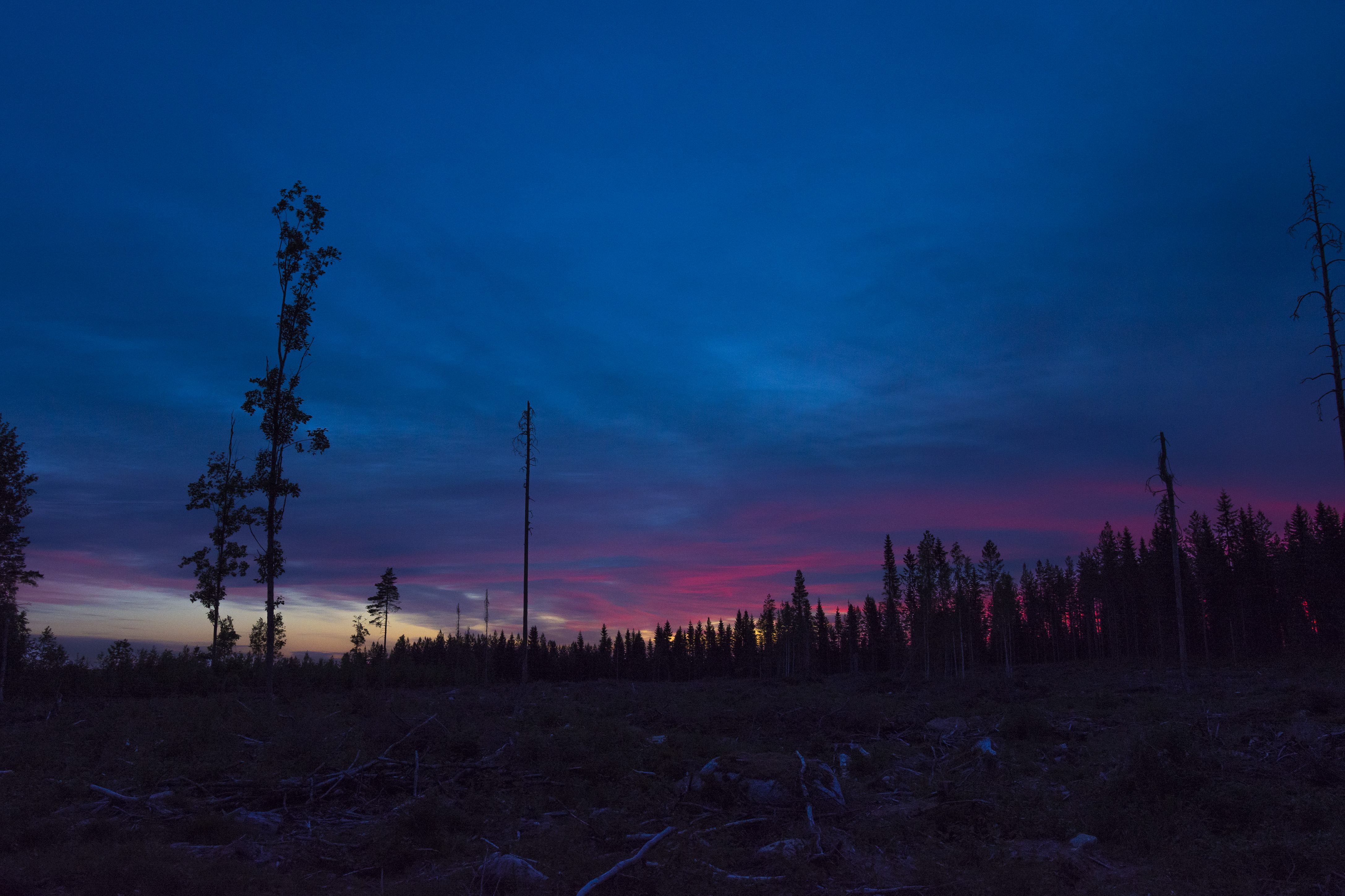 It's 3am, I'm on my pj's, and it's only 6 degrees Celsius, even though the temperatures in the daytime have been well over 20 degrees. If you look at the last picture closely, you can see a bright orange between the trees, and I was very tempted to go closer. But it was the middle of the night, I wasn't wearing much and no one knew that I had gone out, so I didn't want to risk getting eaten by a bear. It is no joke, a couple roam very close to our house, though the bigger threat is a huge dog that lives few kilometres away and has bitten many people. I usually carry a knife when I go to the woods, but this time I ran out so fast that I only had my camera with me.