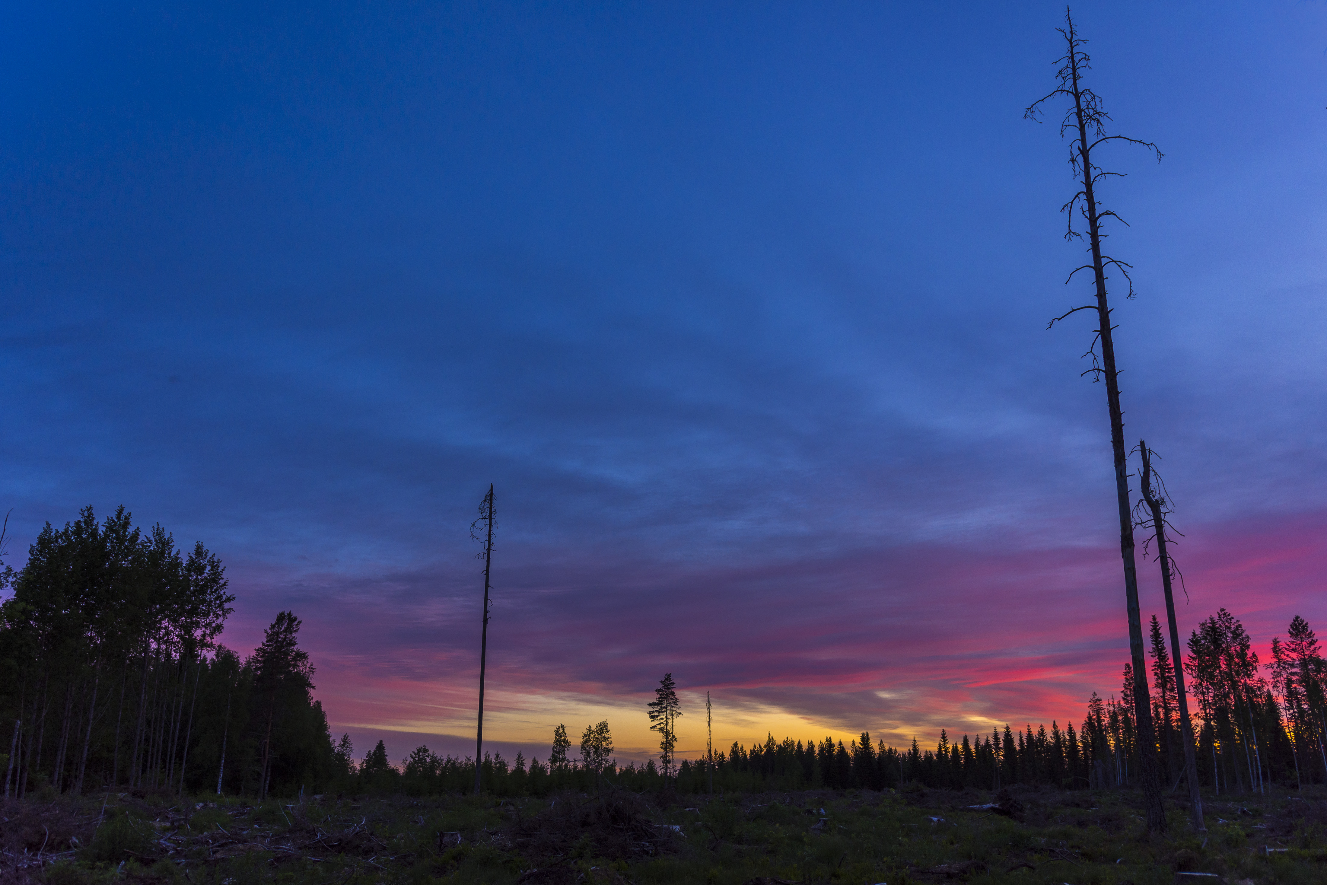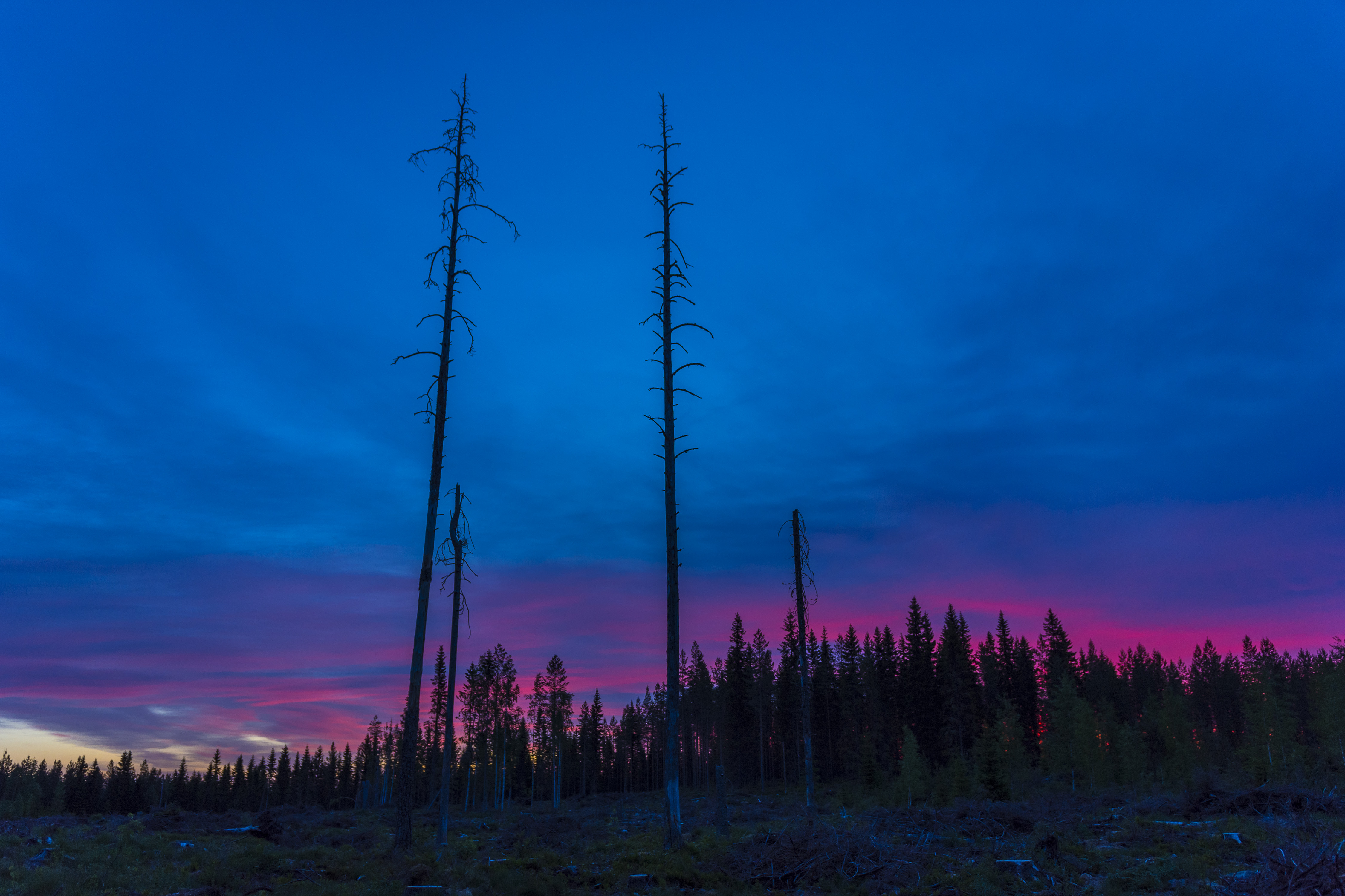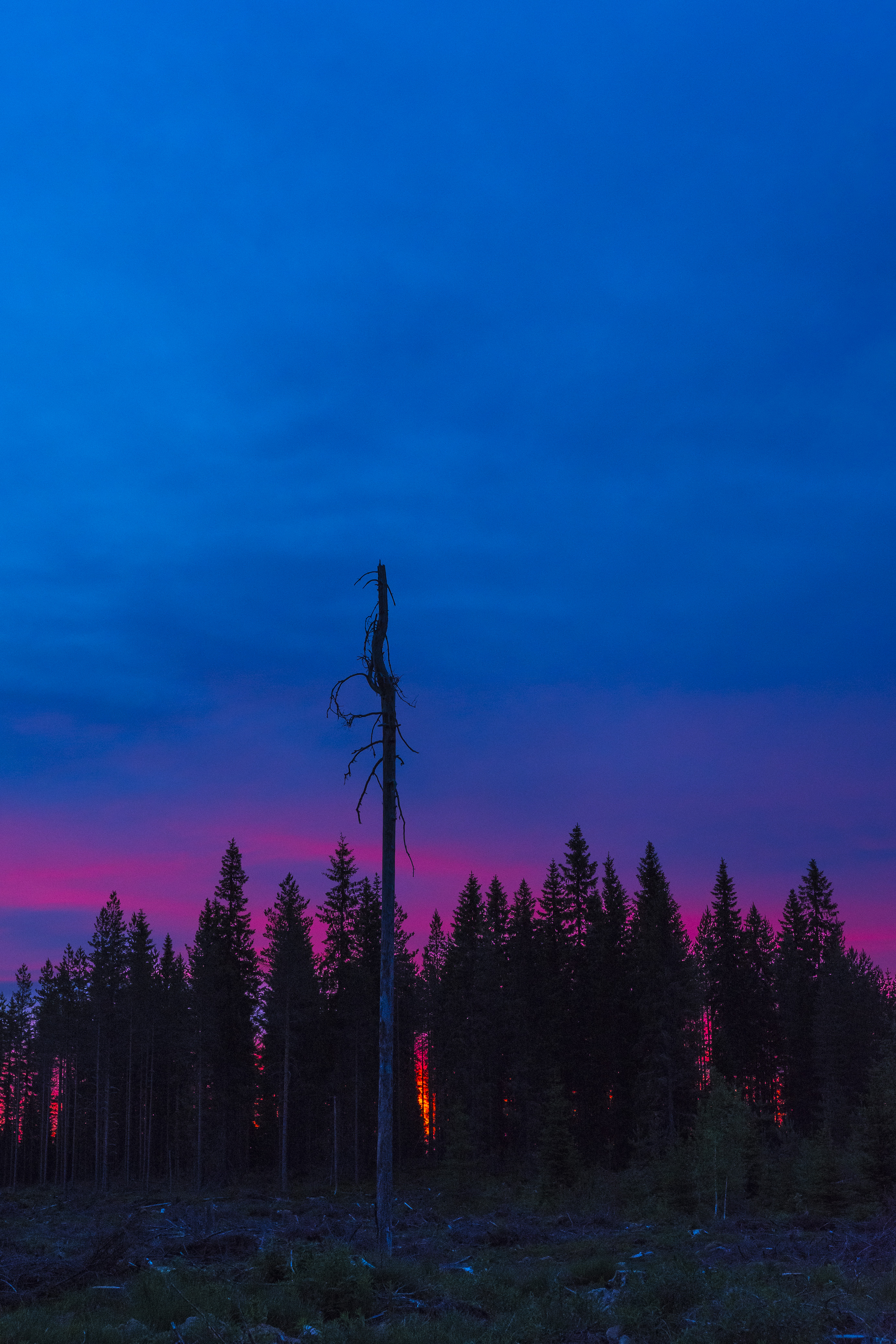 It's 3am, I'm on my pj's, and it's only 6 degrees Celsius, even though the temperatures in the daytime have been well over 20 degrees. If you look at the last picture closely, you can see a bright orange between the trees, and I was very tempted to go closer. But it was the middle of the night, I wasn't wearing much and no one knew that I had gone out, so I didn't want to risk getting eaten by a bear. It is no joke, a couple roam very close to our house, though the bigger threat is a huge dog that lives few kilometres away and has bitten many people. I usually carry a knife when I go to the woods, but this time I ran out so fast that I only had my camera with me.