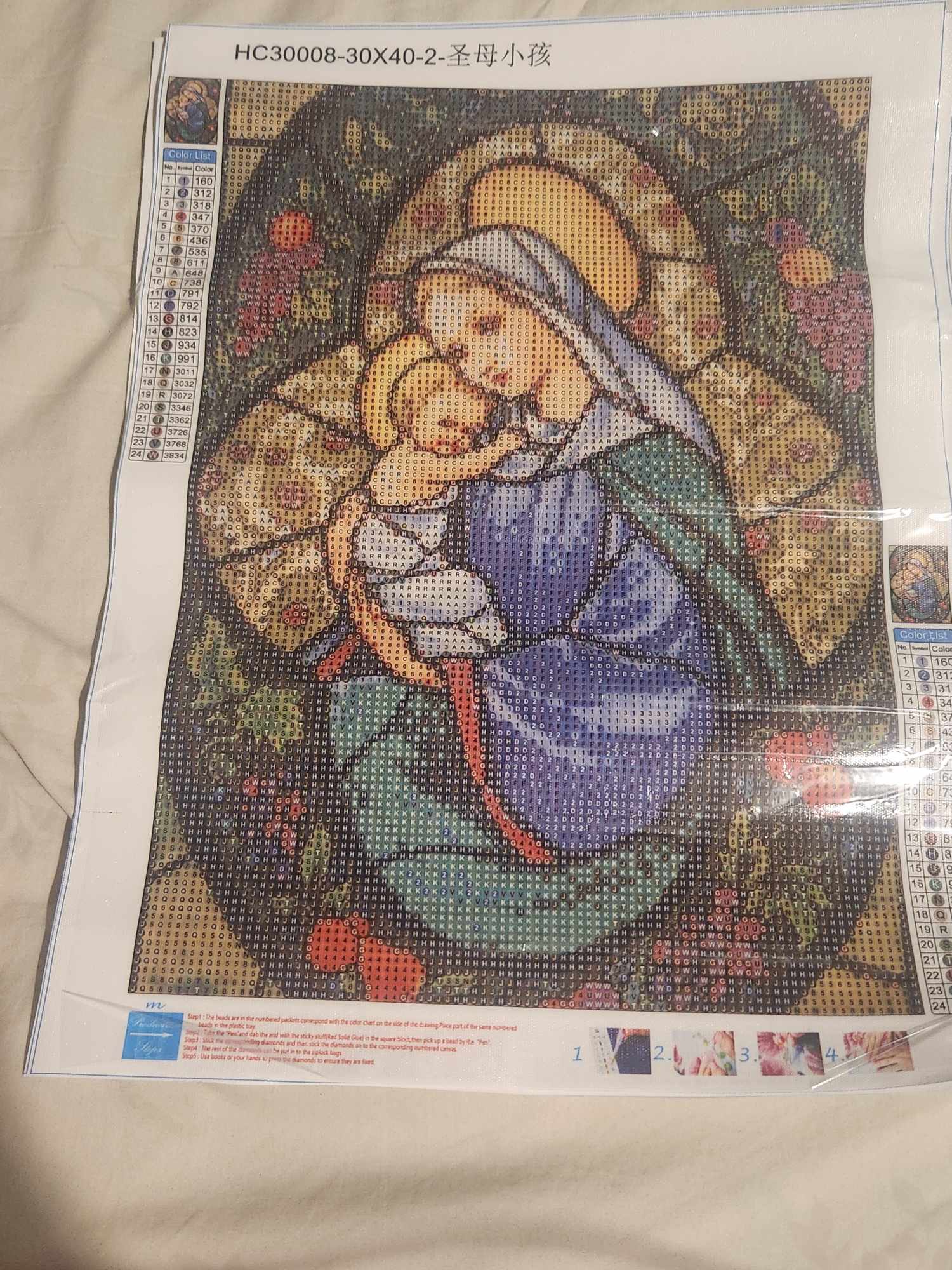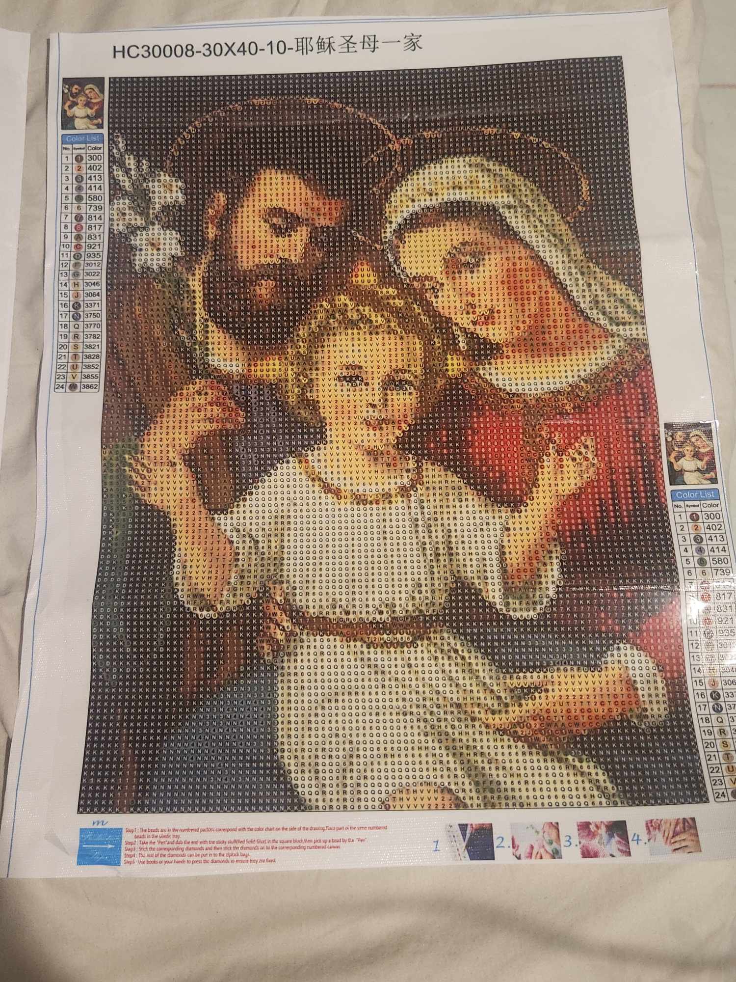 Each number or letter on the canvass corresponds to a particular bead or rhinestone which comes along when you order a canvass.