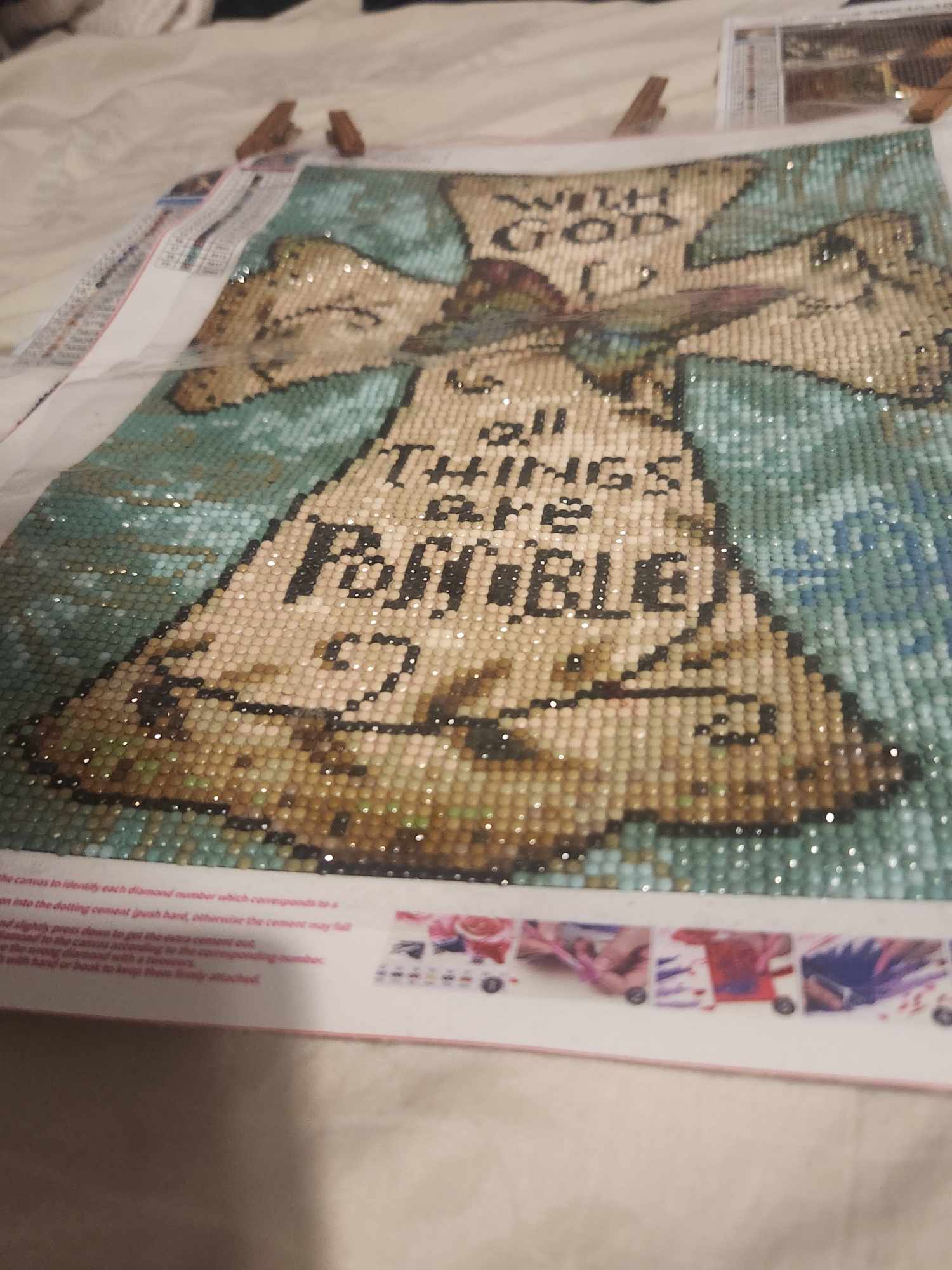 Enjoying so far? Now what makes the rhinestones stick to the canvass? Diamond painting canvasses are made using two different types of adhesive. Some companies use double-sided tape, while others use poured glue on the canvasses. Both are transparent, but it seems there is a general consensus that the best brands are those that use poured glue. For the ones my wife ordered, they are poured glue.