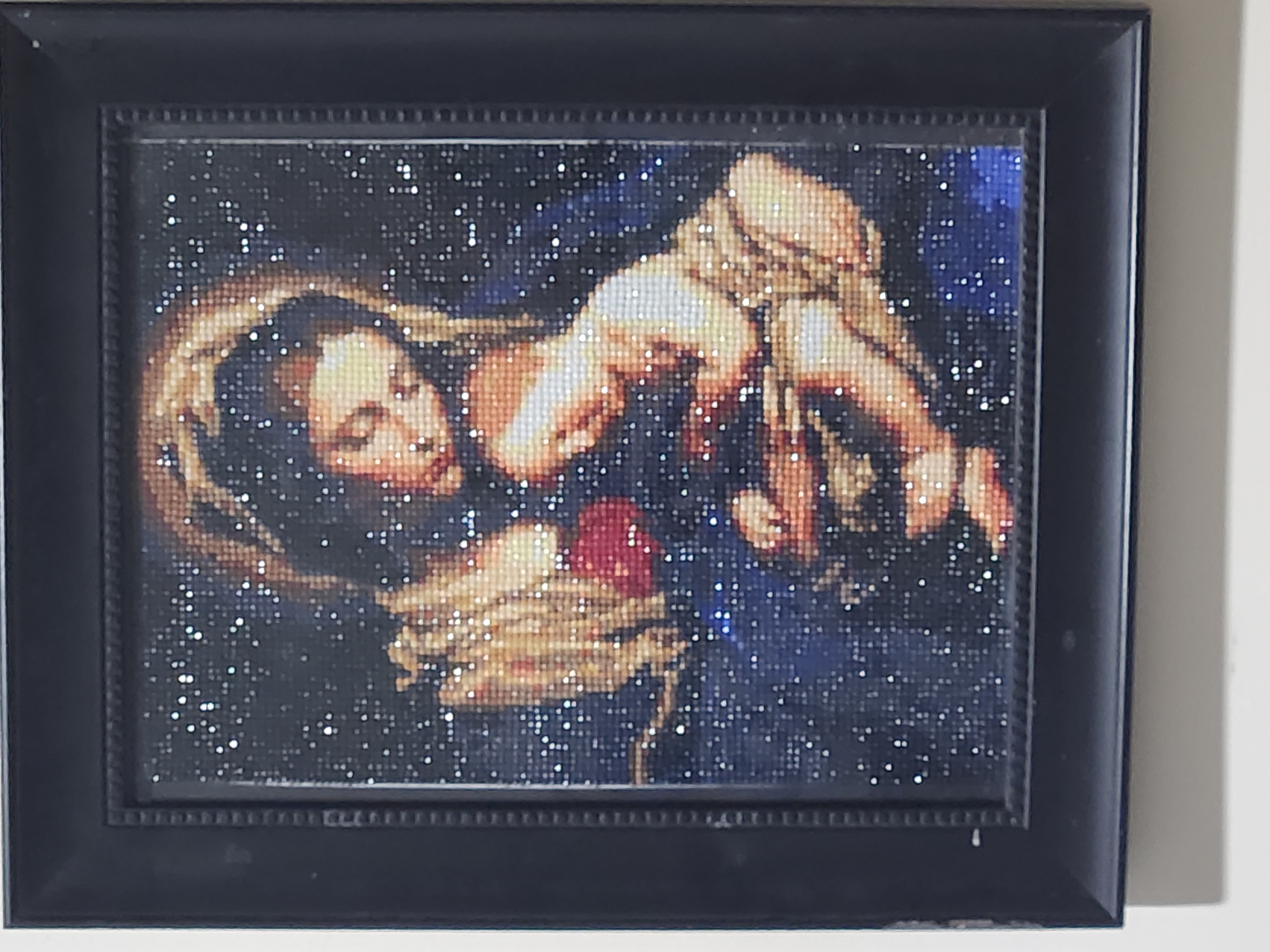 Now that you asked the answer is actually, yes. Most of the art my daughter does are sold so there's not much to hang. My wife's cross-stitch frames, and now her diamond paintings, she usually gives them away as presents. Again, not much to hang there. My PhotoChain pictures are all stored in my phone so nothing to hang there. So what's left to hang are the ones that haven't yet been given away. Like this most recent Diamond Painting my wife finished and framed. I think the neck pain and eye strain were worth all the effort