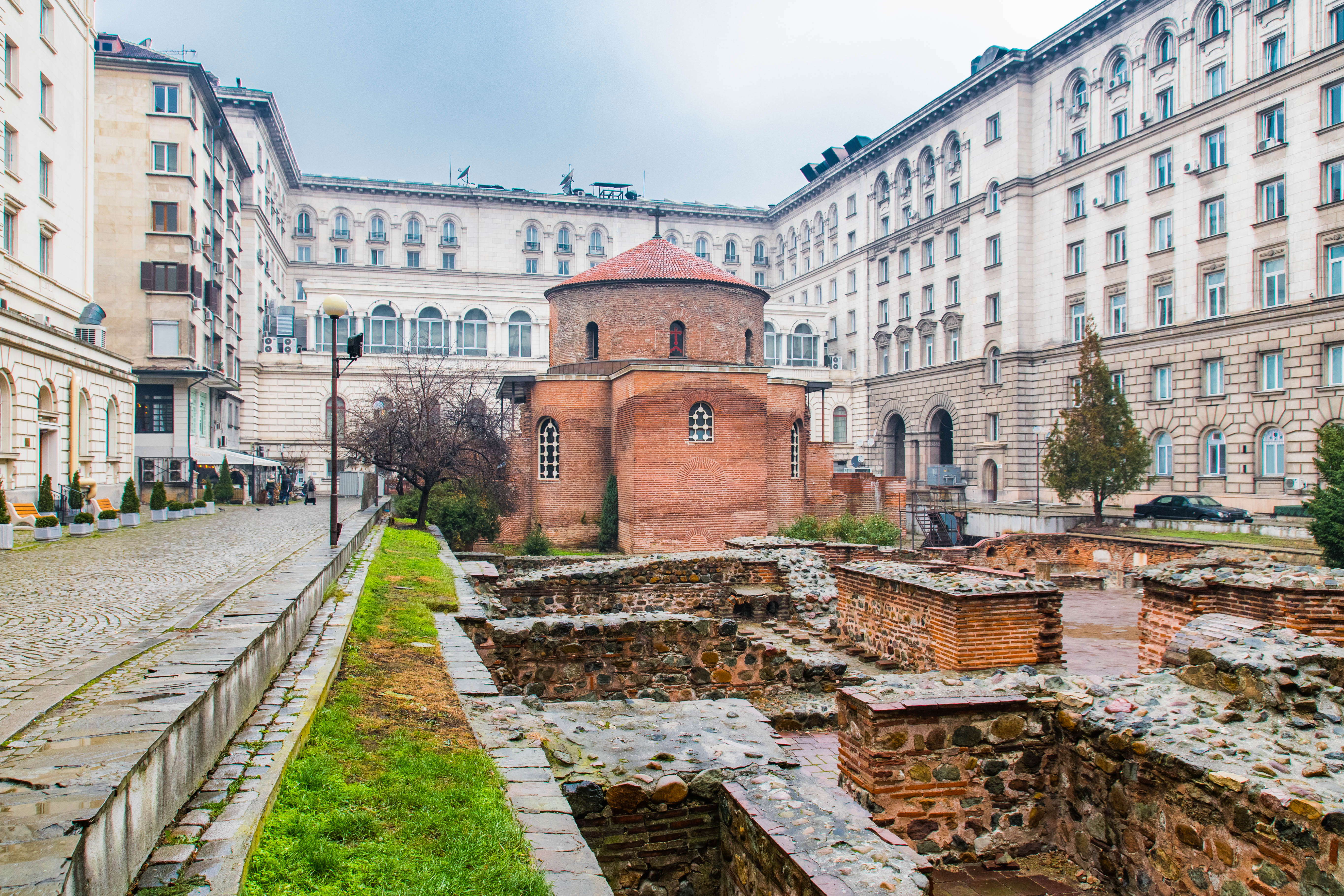 It is located in the inner courtyard between the buildings of the Balkan Hotel and the Presidency at a level a few meters below the contemporary streets of Sofia.