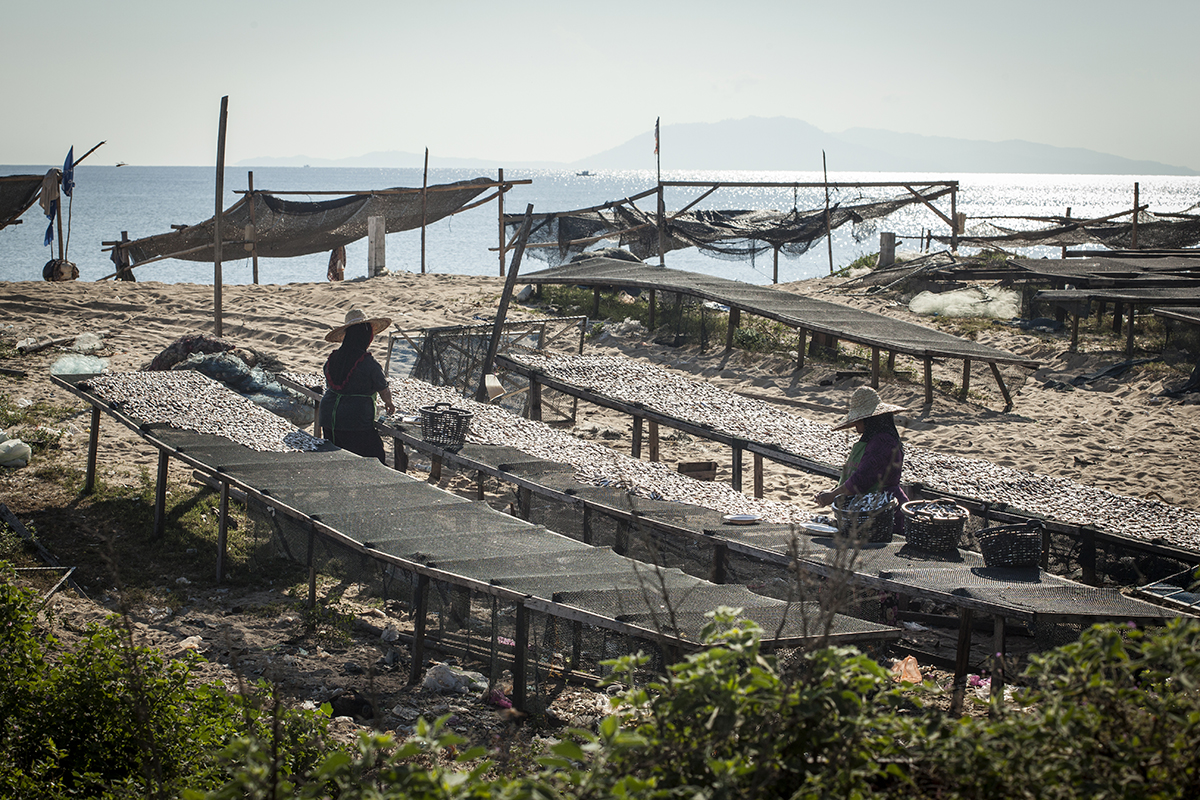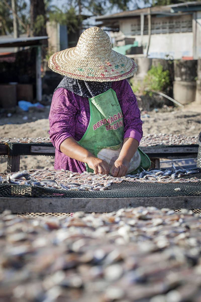 Further back on the beach there were women laying out fish to dry in the sun on a much larger scale than I has seen earlier. They were wearing traditional straw hats to protect themselves from the baking heat.
