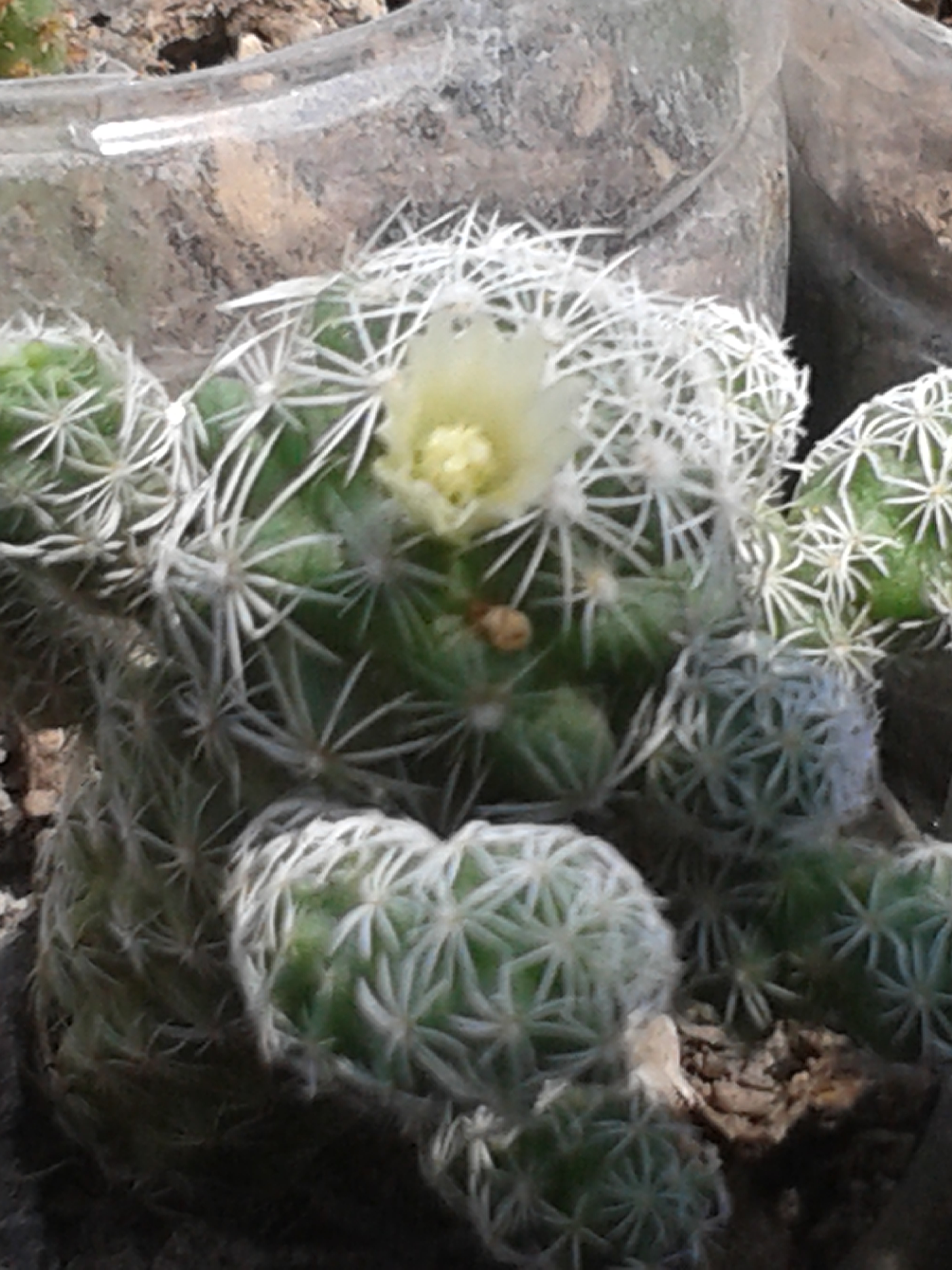 Es un cactus. La mammillaria Gracilis. Presenta un tallo que es su columna, de donde nacen los pequeños hijuelos. Se colocan uno a uno alrededor de la planta madre. Las espinas en forma de estrella, son radiales y de color blanco. El cactus está en floración y deja ver su tonalidad amarilla.