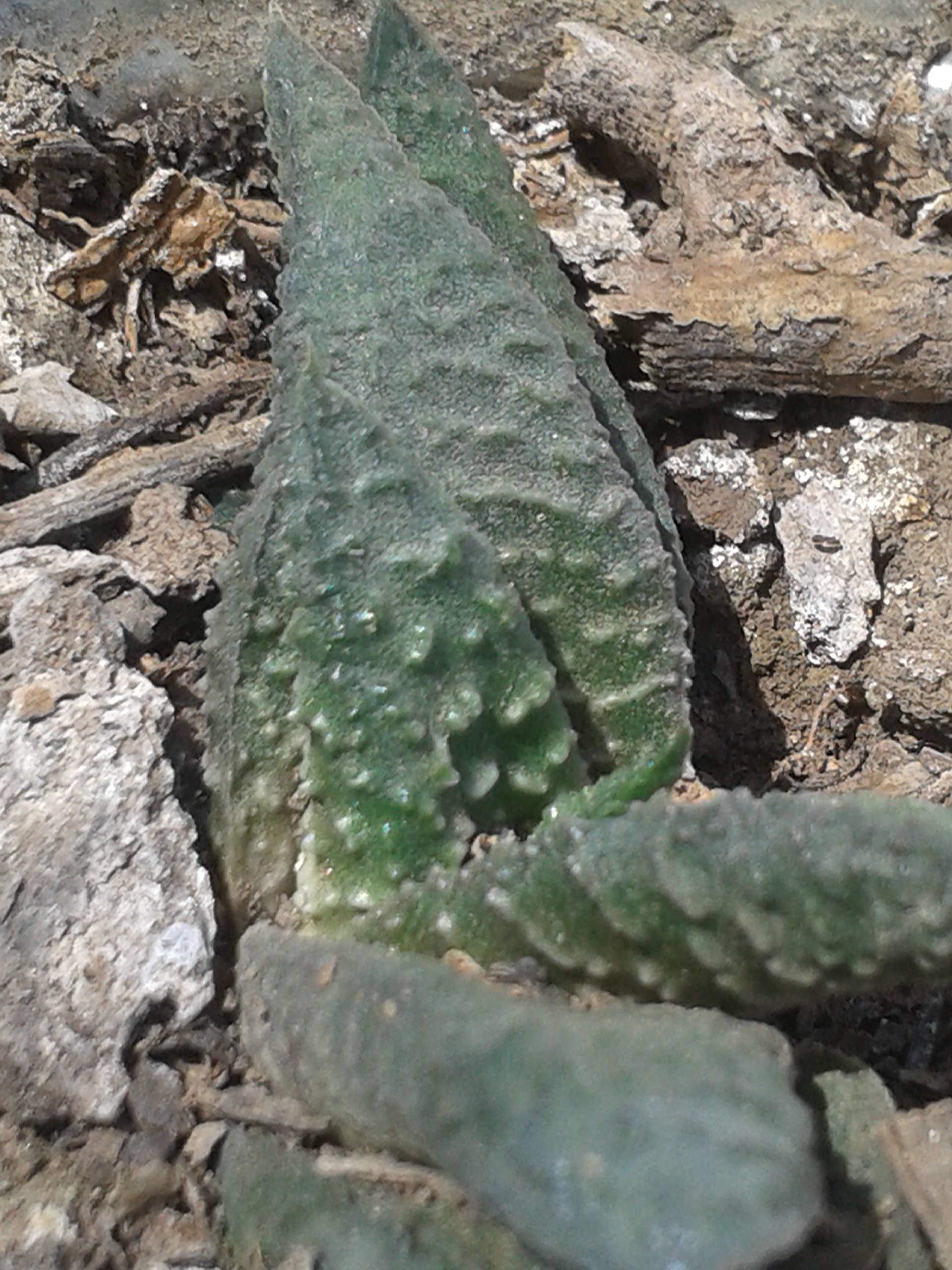 Es el Aloe juvenna. Sus hojas son carnosas y lanceoladas, tienen en su borde pequeñas prolongaciones espinosas, frágiles. Se asemejan a los colmillos de un animal carnívoro. No tienen tallo. Son de color verde oscuro y pueden obtener tonos en marrón según la exposición al sol.