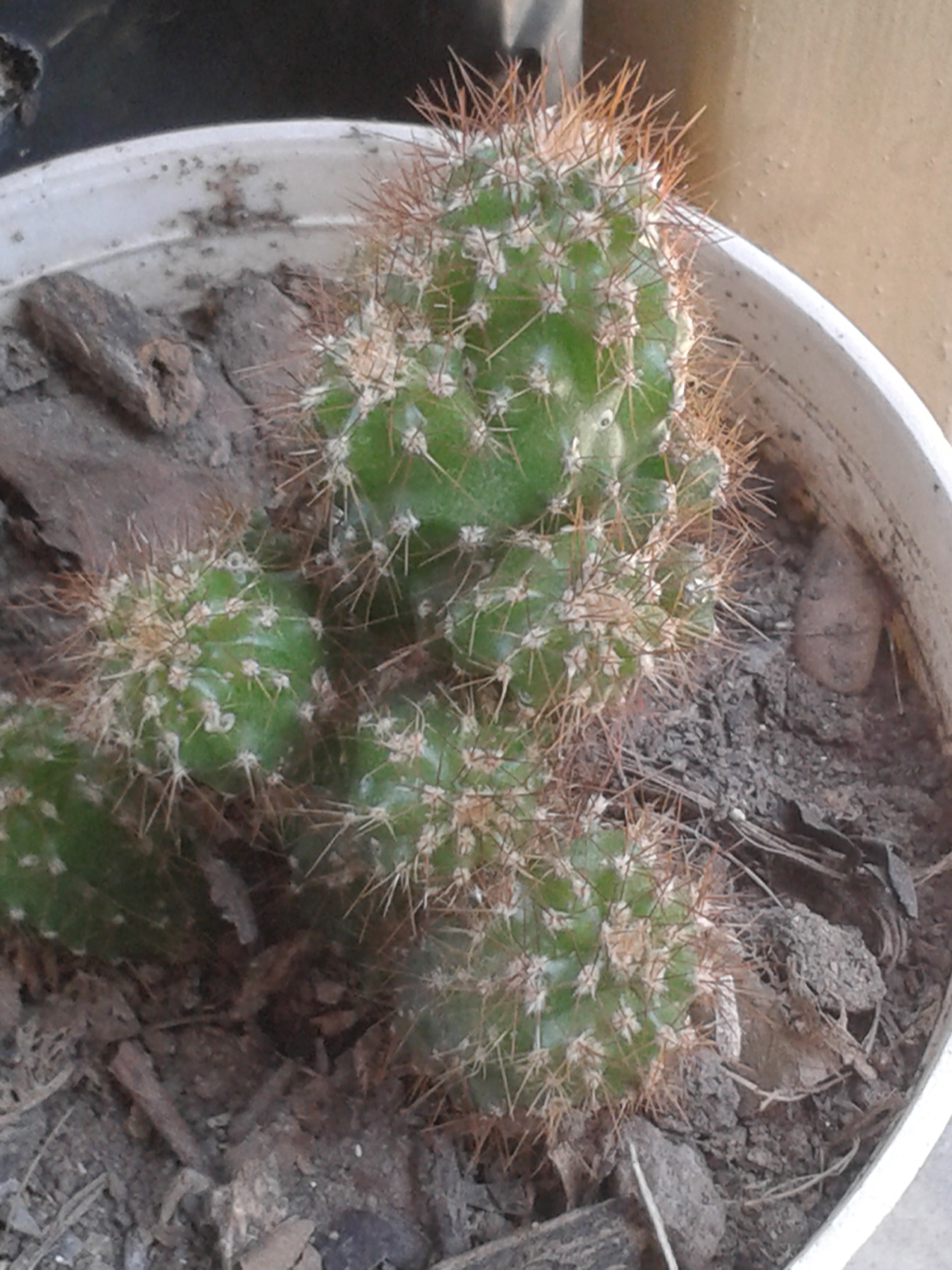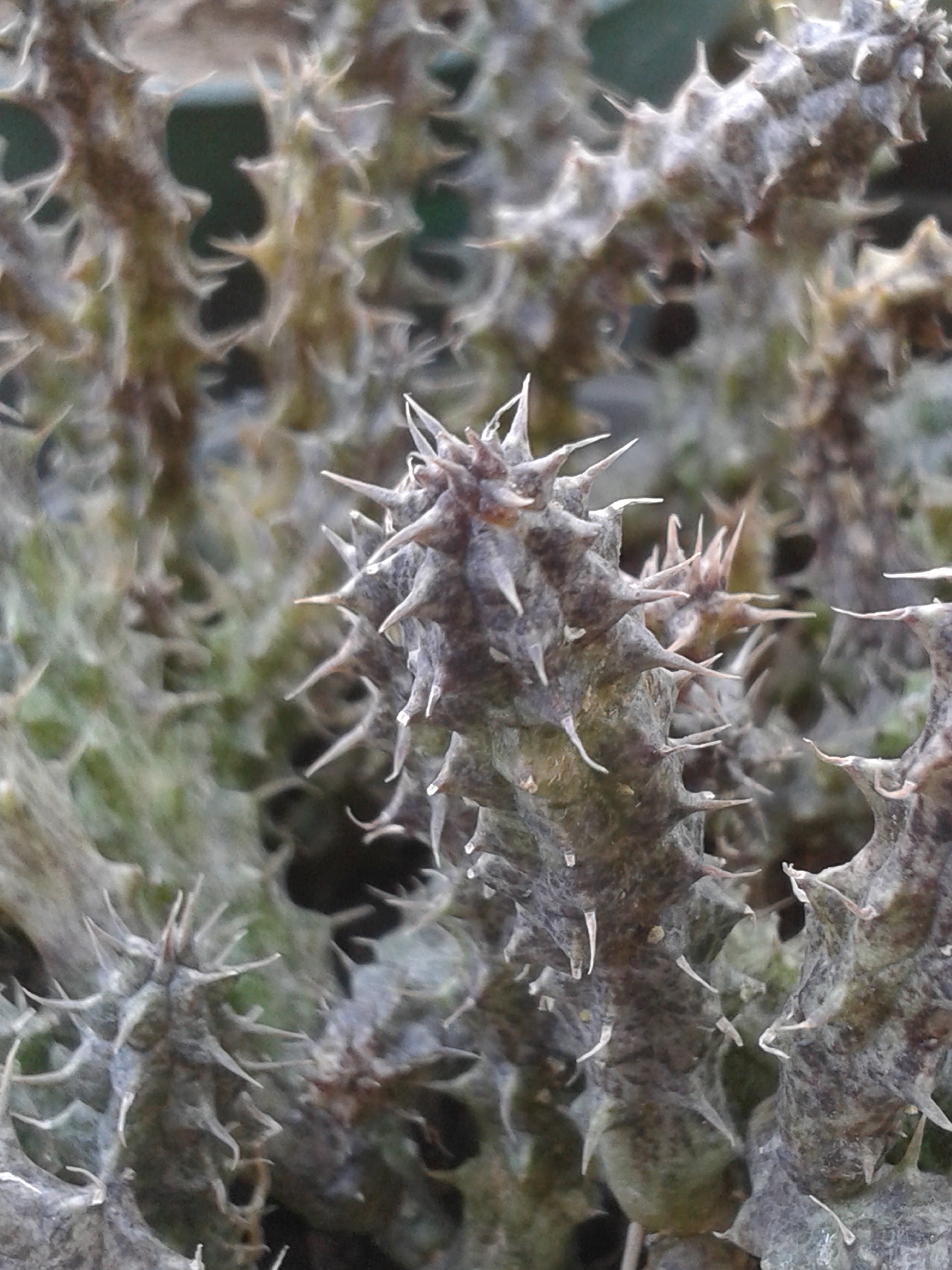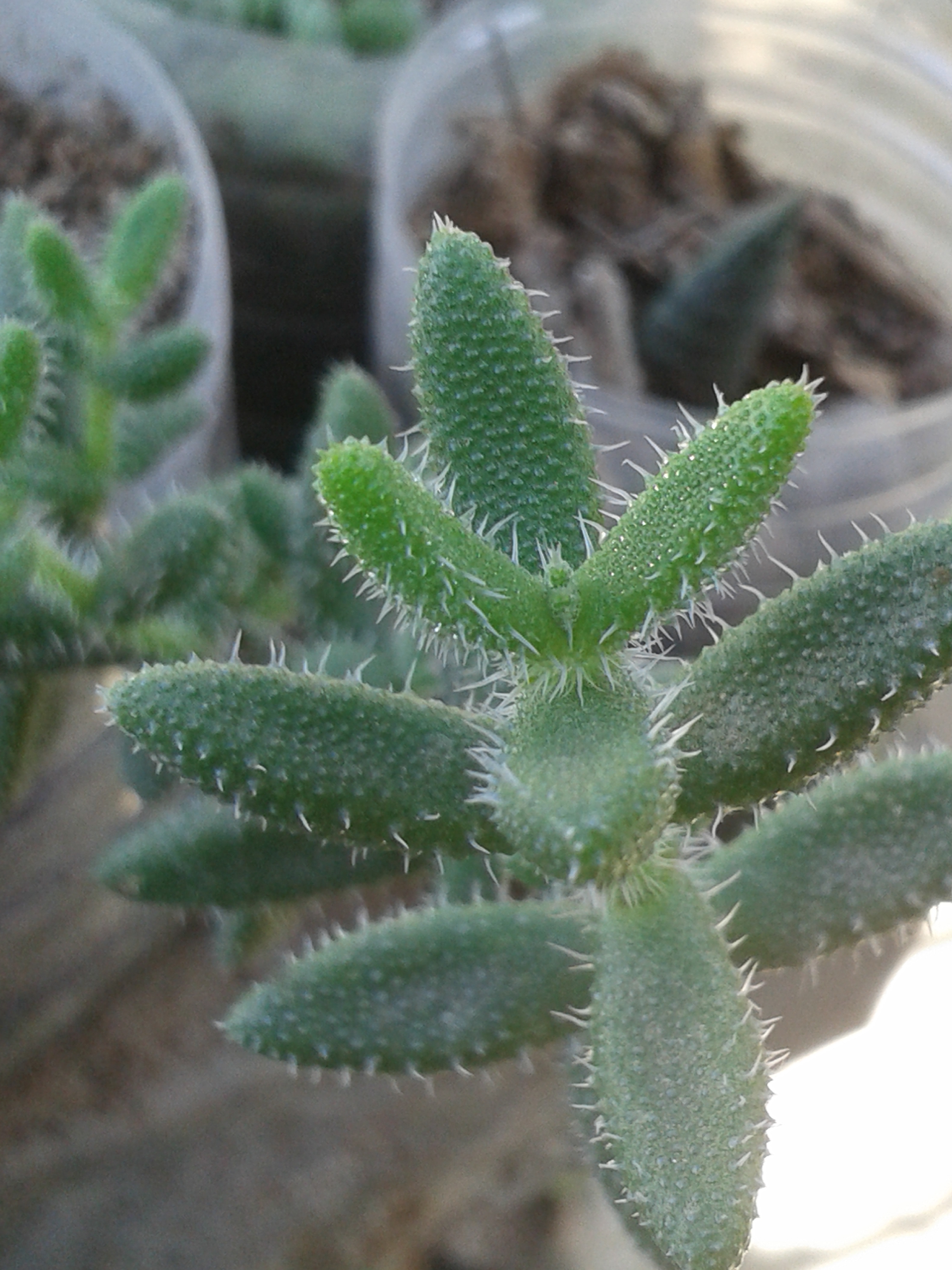 Huernia boleana is its name. It's another succulent, whose spines do not grow rigid and are fragile, on a thick but flexible stem. They have a variety of green depending on their exposure to the sun.