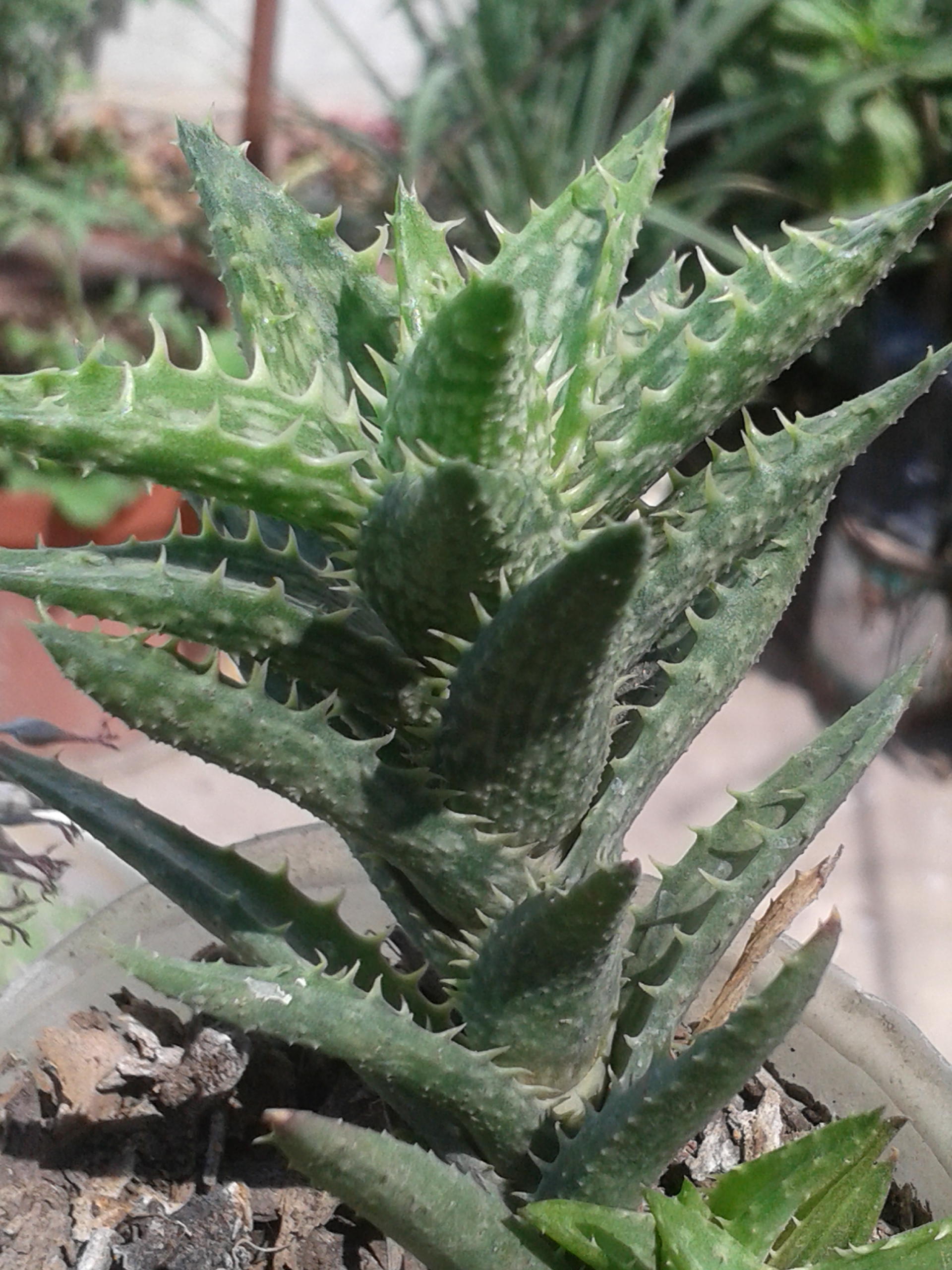 It's the Juvenile Aloe. Its leaves are fleshy and lanceolate, with small, prickly, fragile extensions on their edges. They resemble the fangs of a carnivorous animal. They have no stem. They are dark green in color and can be shades of brown based on sun exposure.