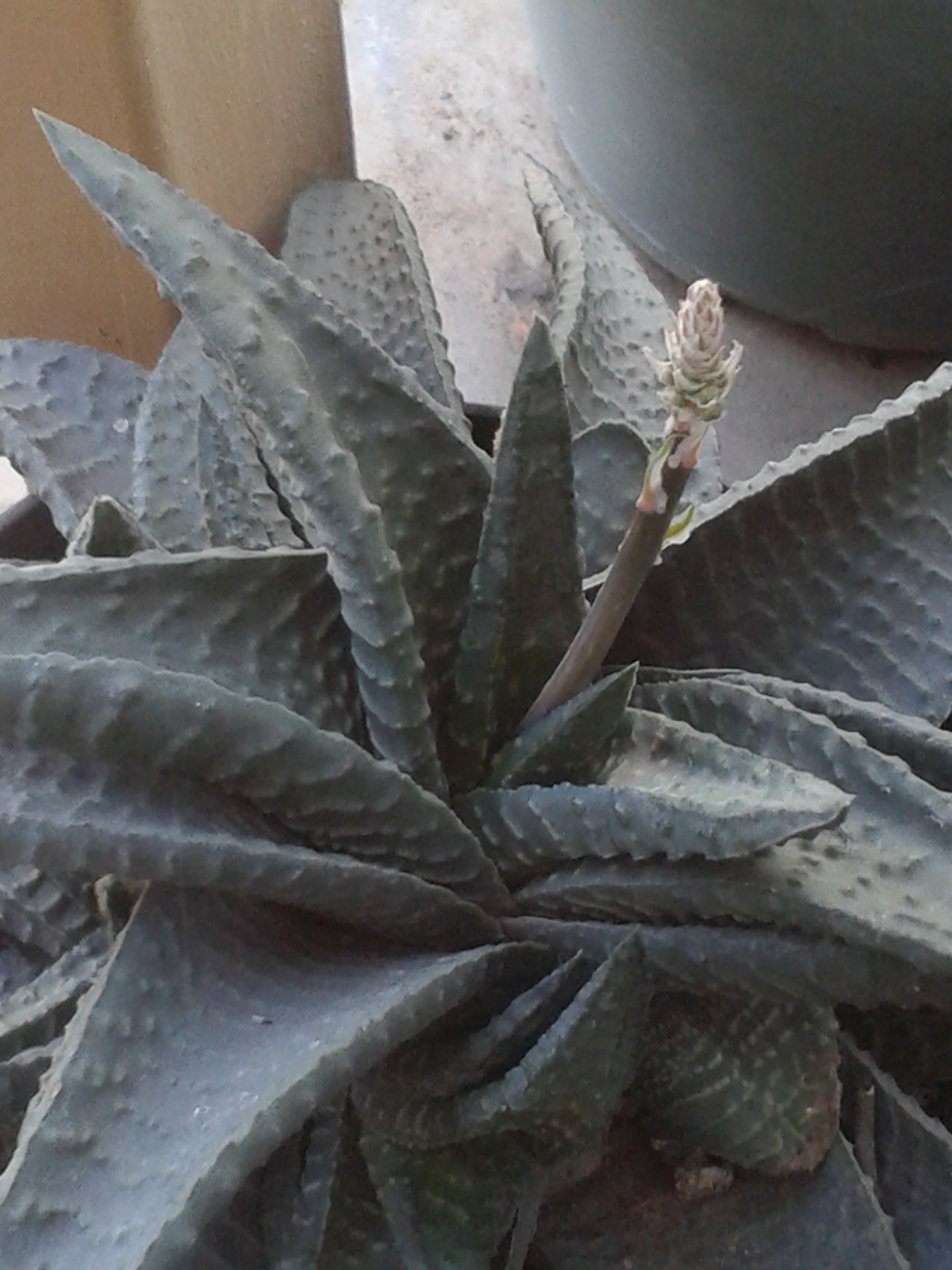 La Haworthia, otra suculenta de color verde oscuro. Sus hojas son carnosas y rígidas, con textura en relieve en toda su superficie. Crecen una al frente de la otra, sin tallo. Recibe el nombre común de planta piel de cocodrilo. De el centro de la planta puede ver un tallo floral. Aún falta mucho por crecer a este tallo. Al final de unos 30 cm aproximadamente, expondrá un racimo de pequeñas inflorescencias de color rosado pálido.