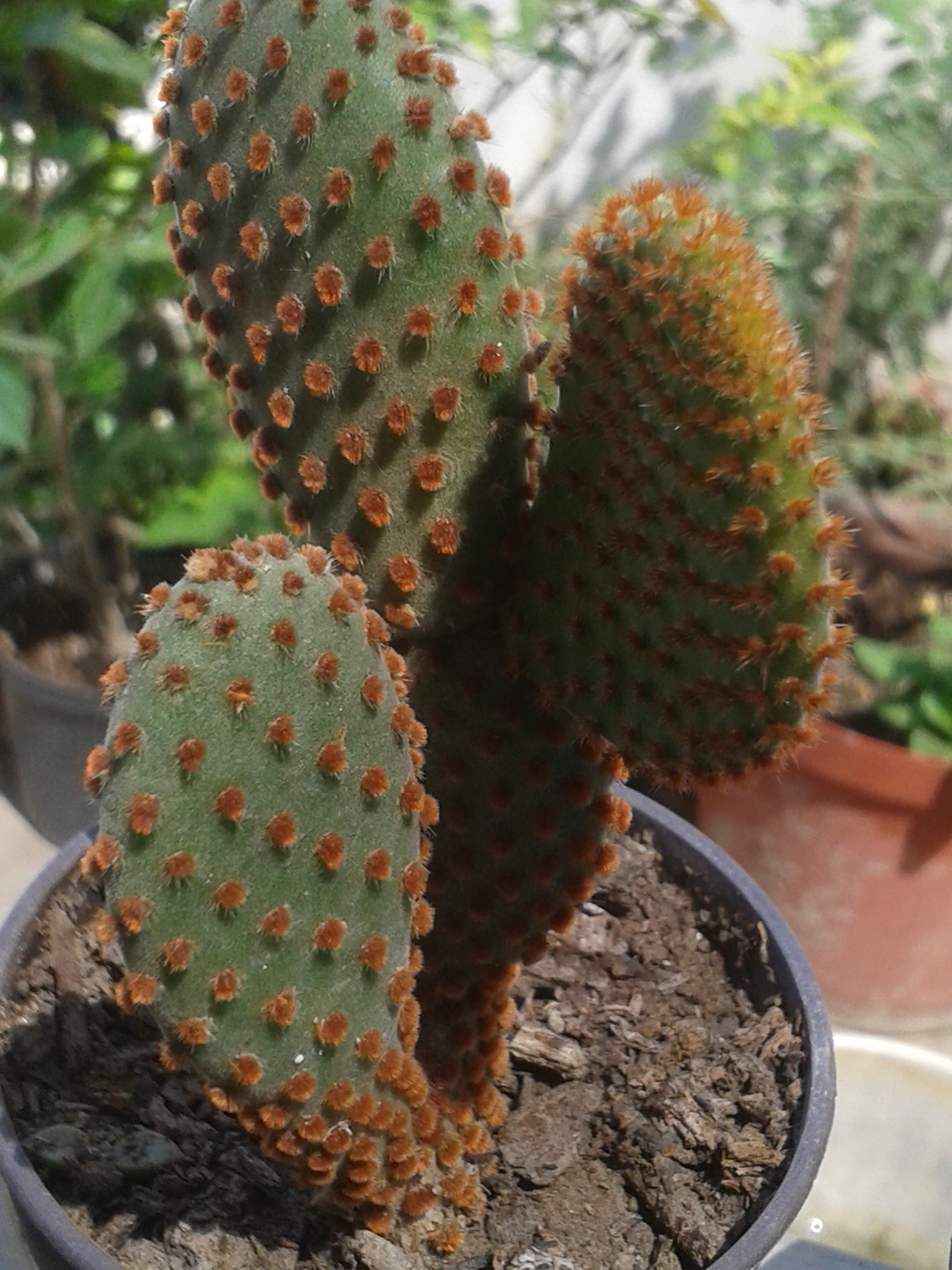We finish with a red Opuntia cactus. Commonly called Mickey ears. It has many red villi, scattered in groups over the entire surface of the cactus, green in color. With a flattened shape, it is shaped like an ear and when the buds come out at the upper end of the body, they are arranged on two sides and appear to be the ears.