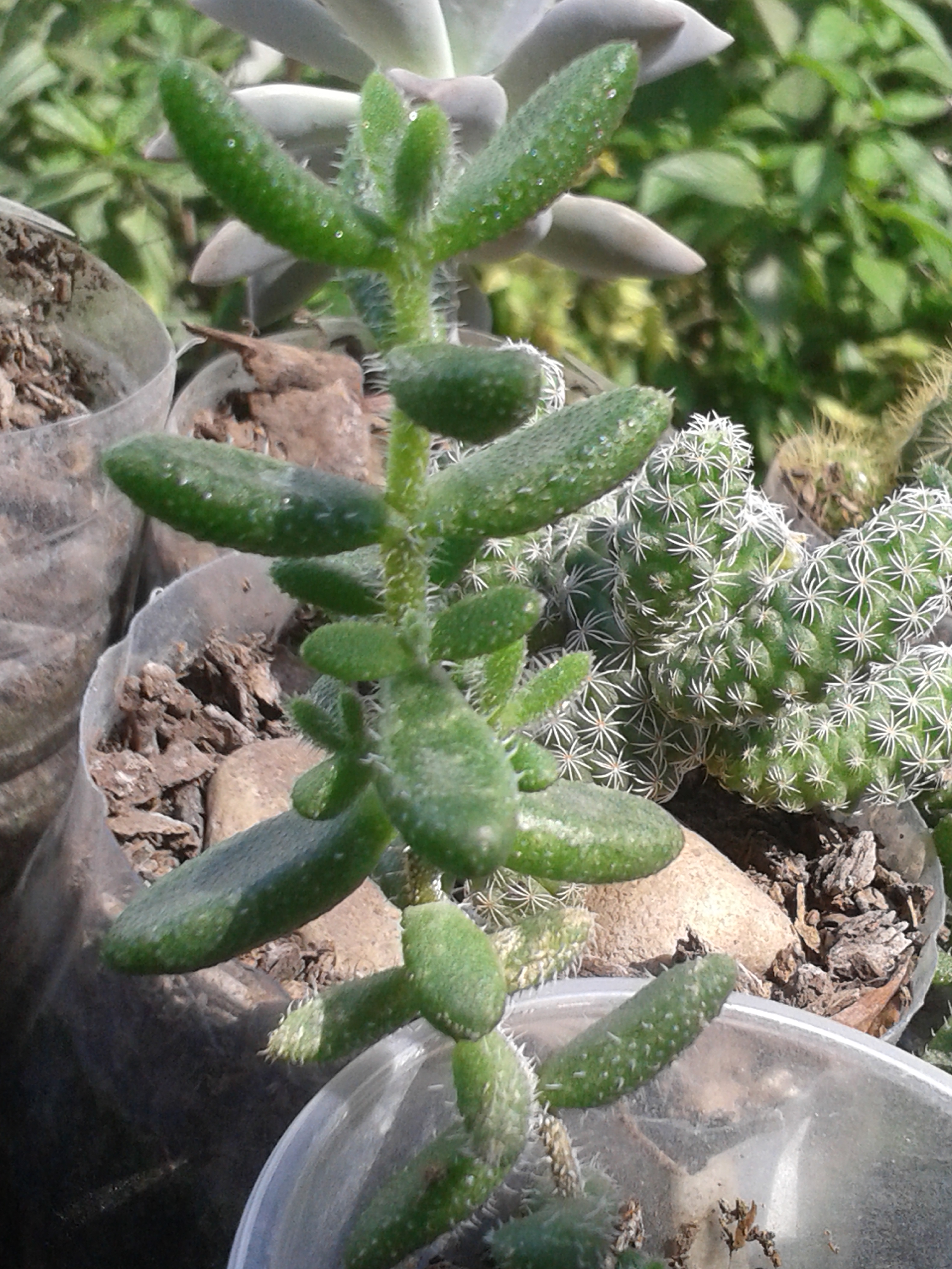 Another succulent. They have a common name of "baby fingers". They have a thin stem, very fragile and sensitive. From where the thick, elongated and green leaves start, with villi on all its surface. They are not prickly.